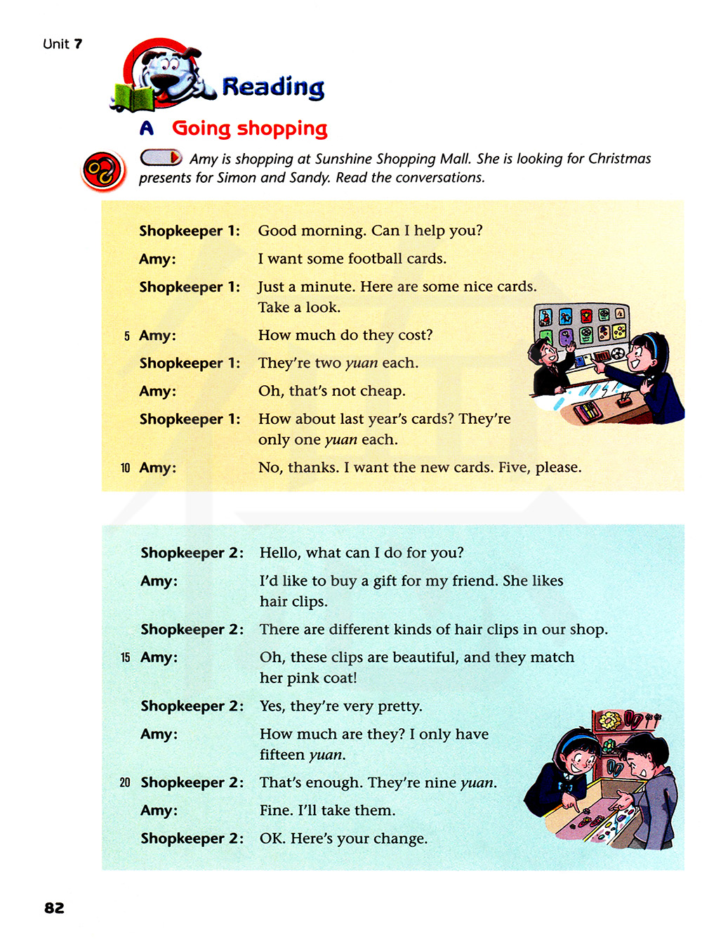 埃米正在阳光大型购物中心购物。她在寻找送给西蒙和桑迪的圣诞礼物。阅读这些对话。