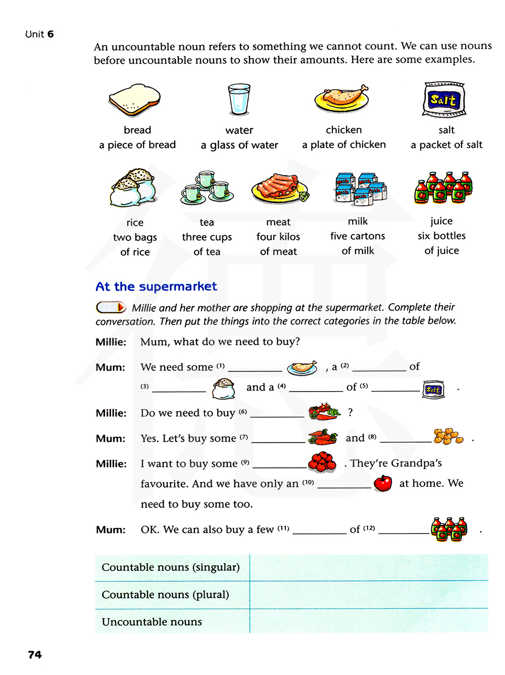 米莉和她妈妈在超市购物。完成她们的对话。然后把这些食物放入下面表格正确的类别中。
