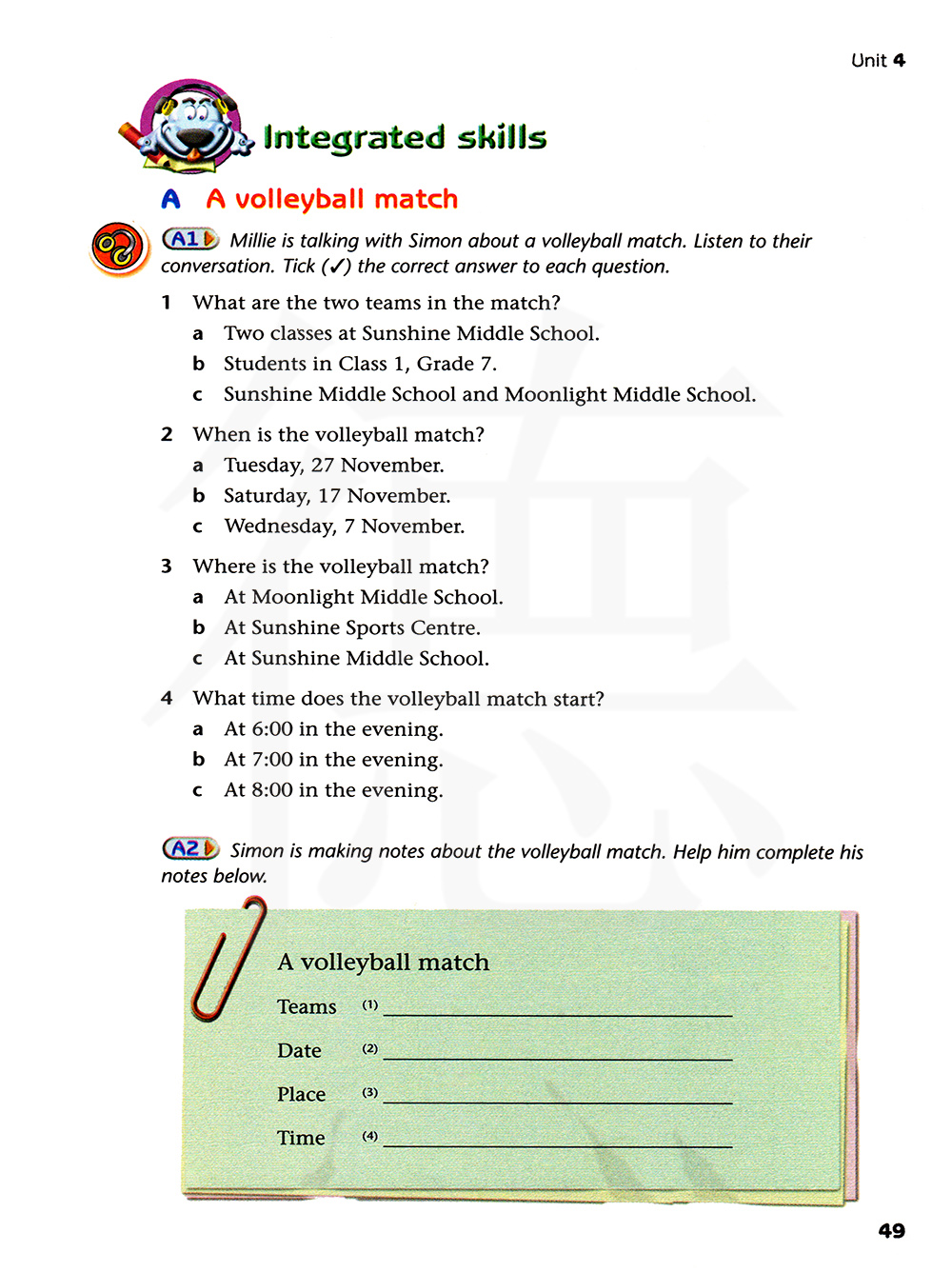 米莉整合西蒙谈论一场排球赛。听他们的对话。在每个问题的正确答案处划勾。