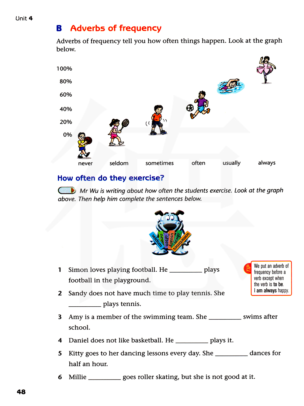 小贴士 除be动词以外,我们把频度副词放在行为动词的前面。我总是很开心。