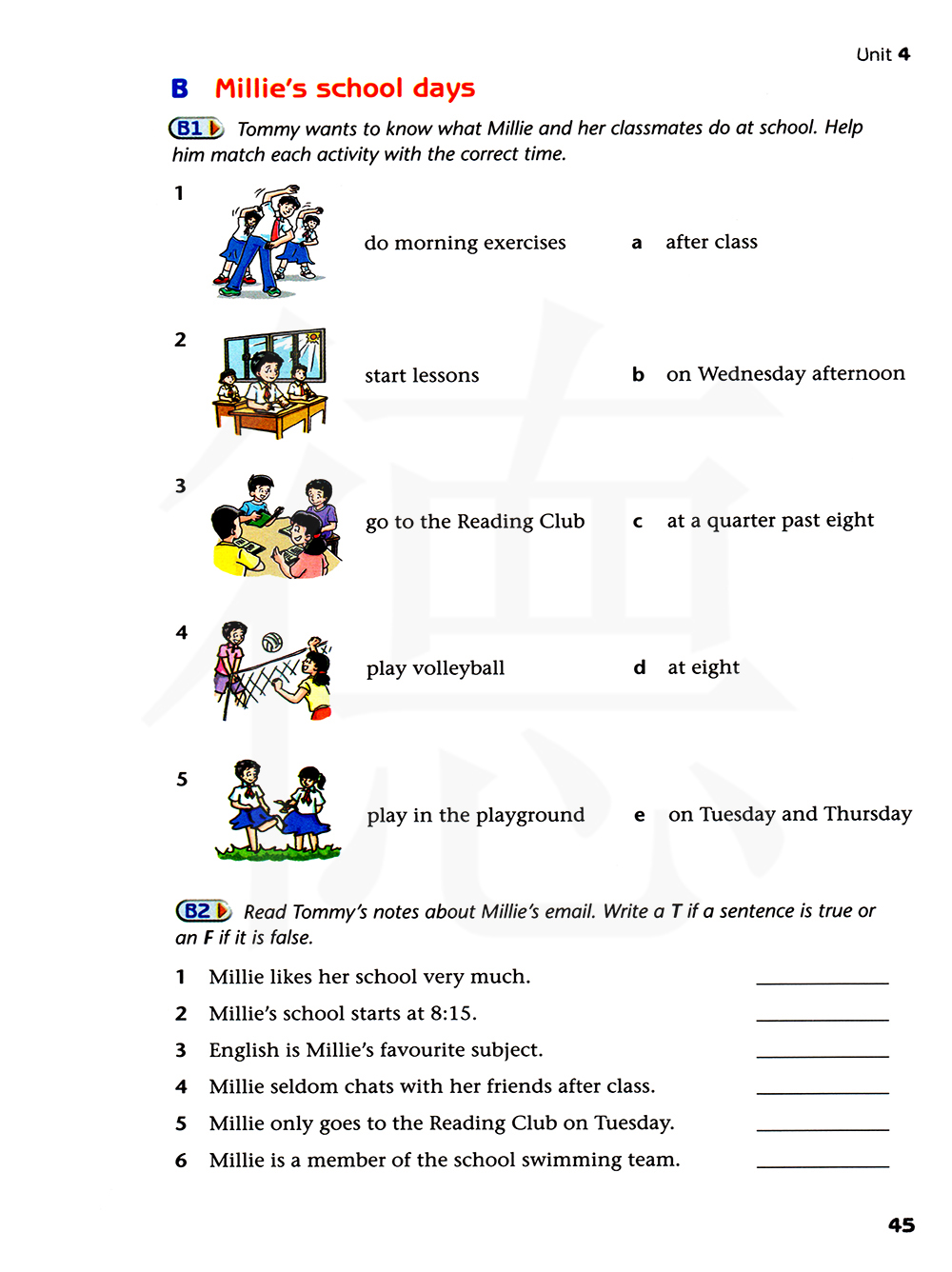 汤姆想知道米莉和她的同学们在学校做什么。帮他把每个活动与正确的时间搭配起来。