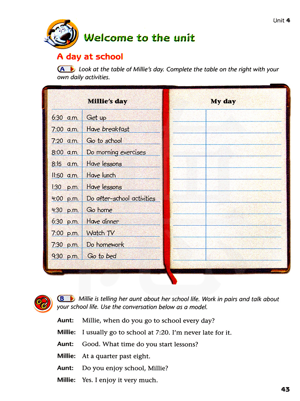 看看关于米莉一天的表格。用你自己的日常活动完成右边的表格。