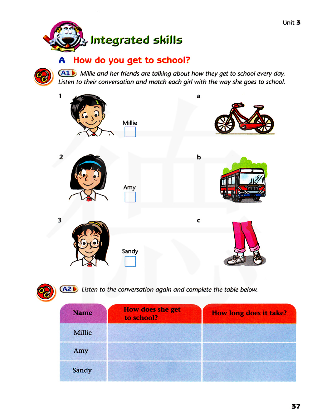 米莉和她的朋友们在谈论她们每天怎样去上学。听她们的对话并把每个女孩和她们去上学的方式搭配起来。