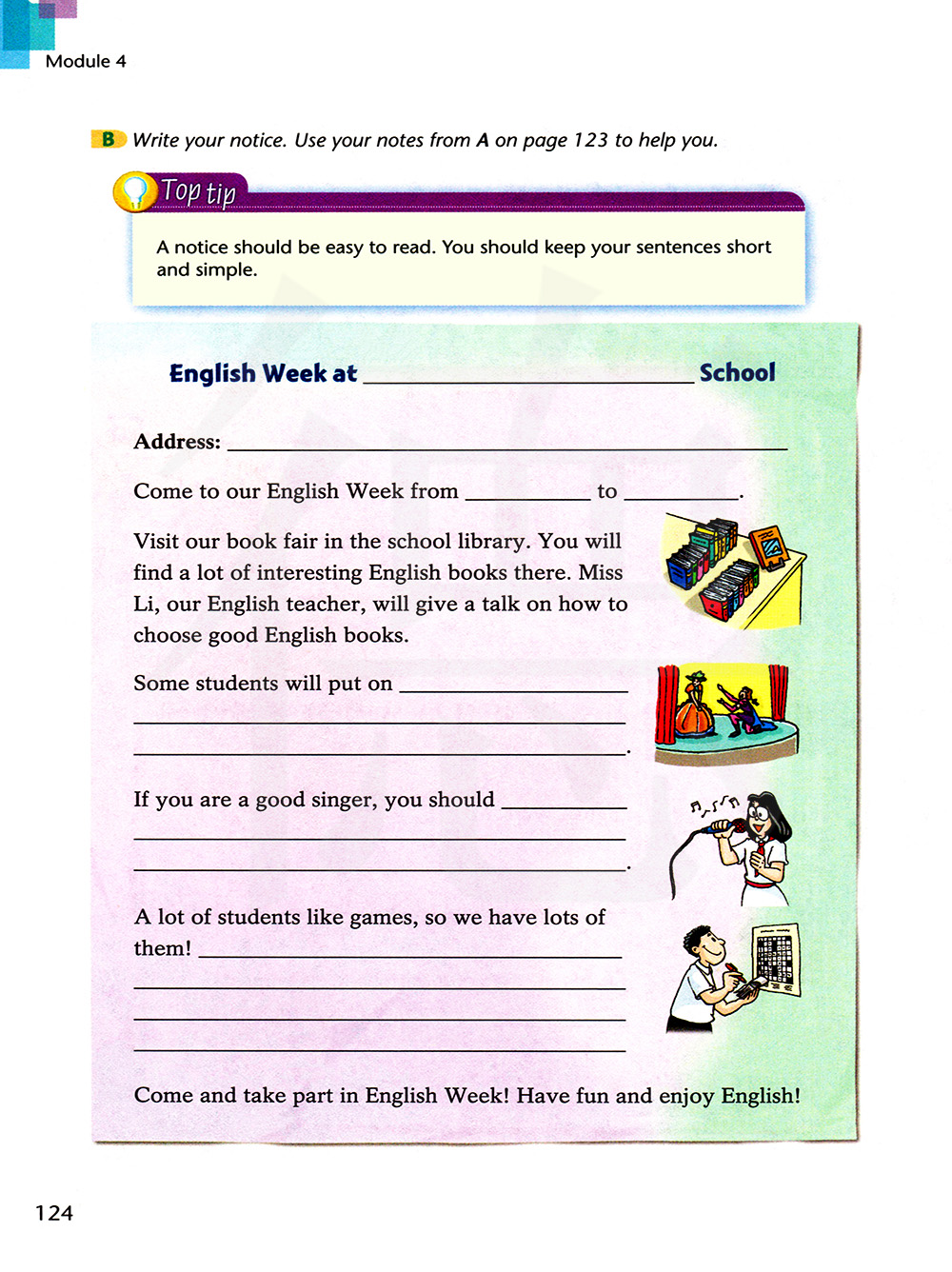 写一写你的通知。使用第123页A中你的笔记帮助你。