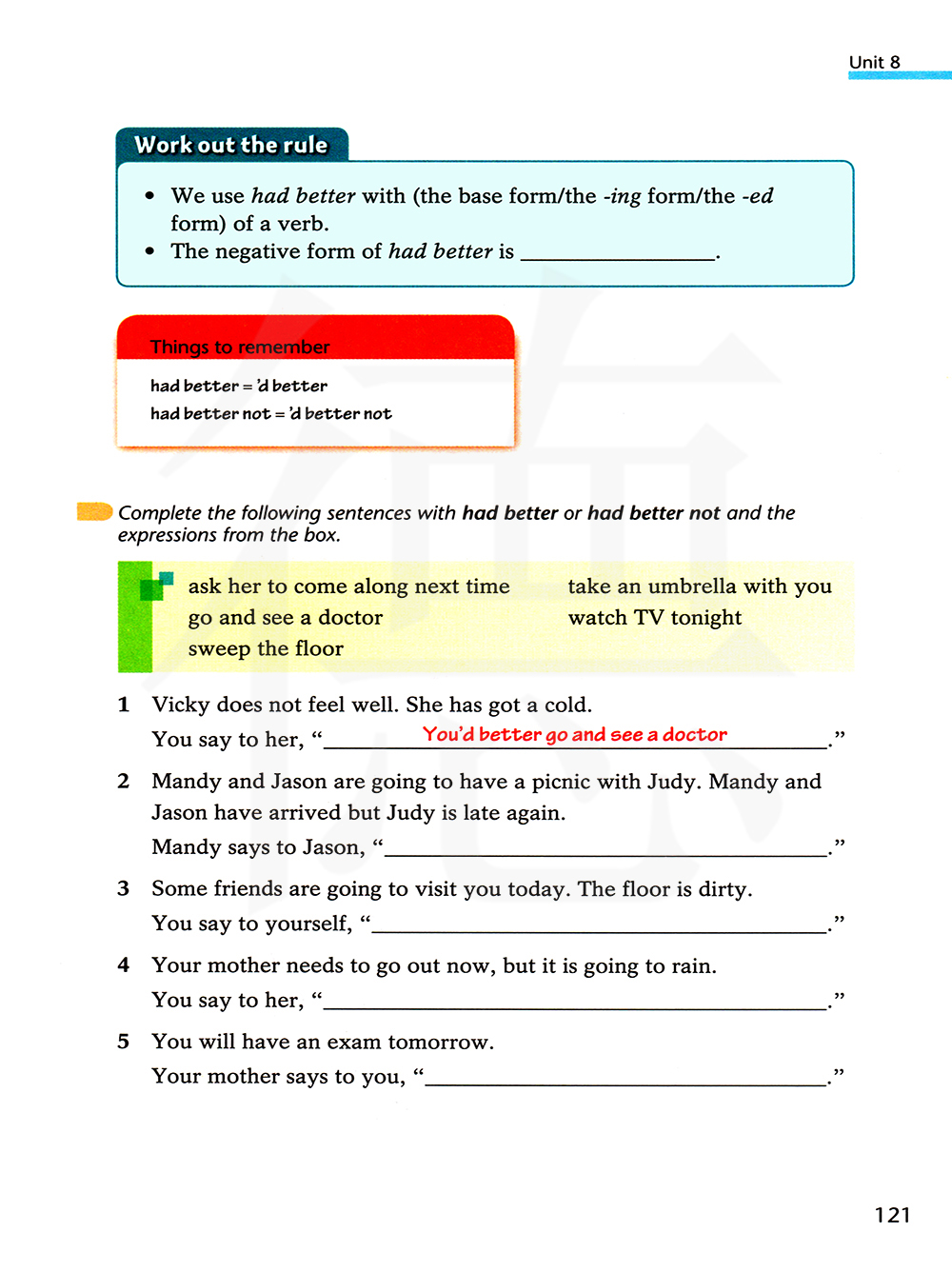 用had better或者had better not和方框里的短语完成以下句子。