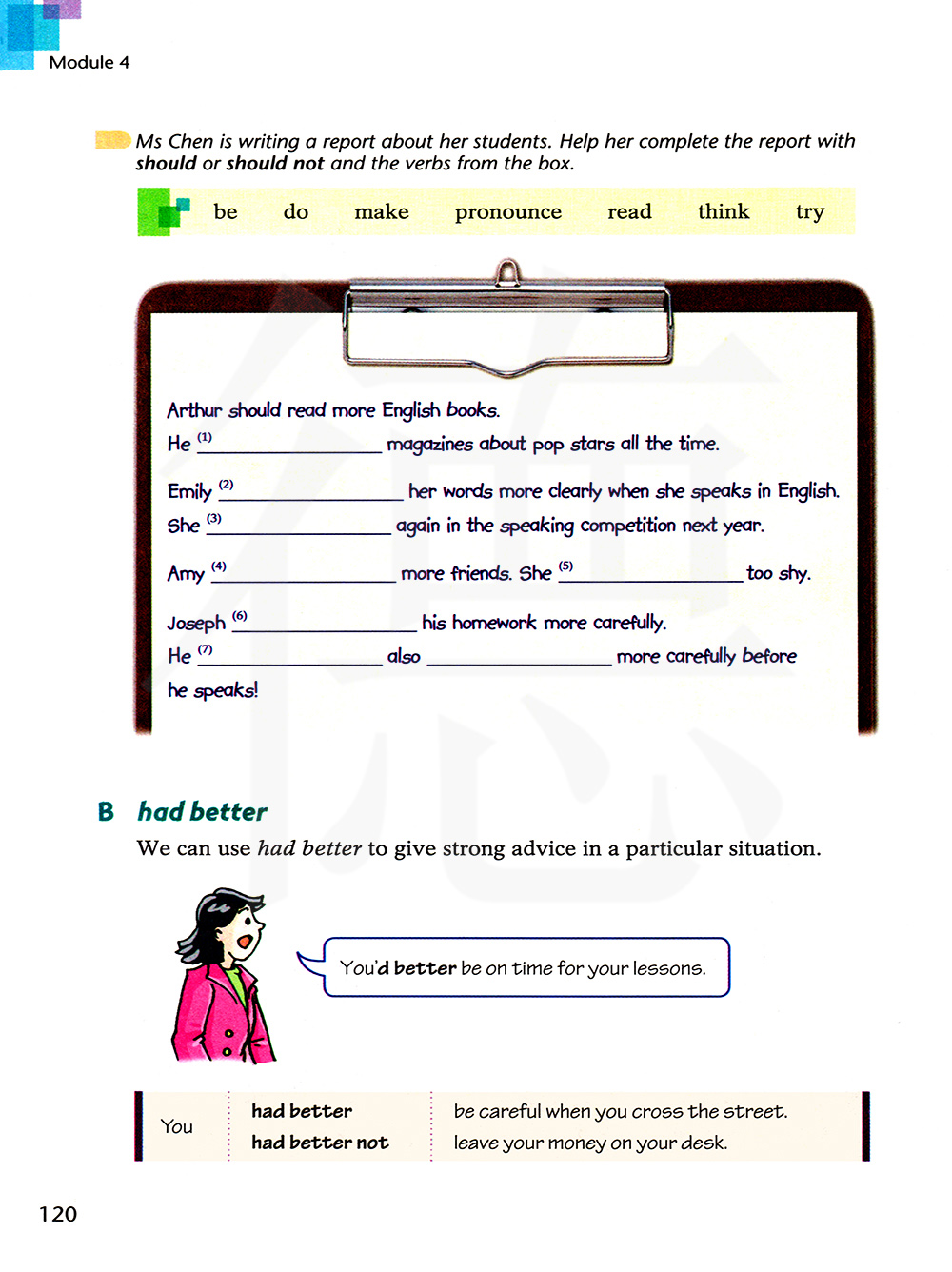陈夫人在写关于她的学生的一份报告。用should或者should not和方框里的动词帮助她完成报告。
