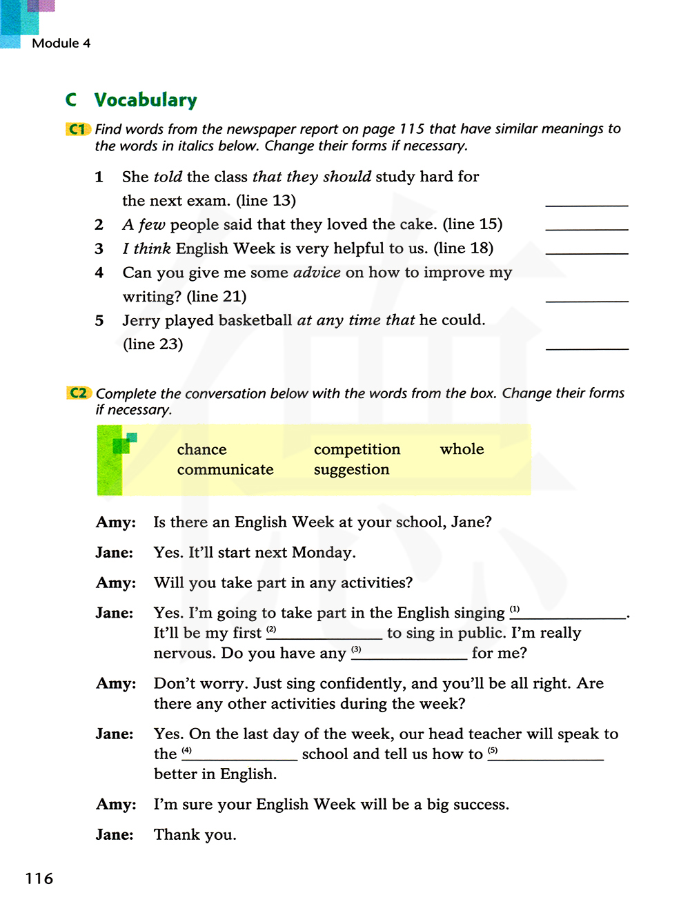 从第115页的新闻报道中找出和下面的斜体字的单词有相同意思的单词。如果有必要的话,改变它们的形式。