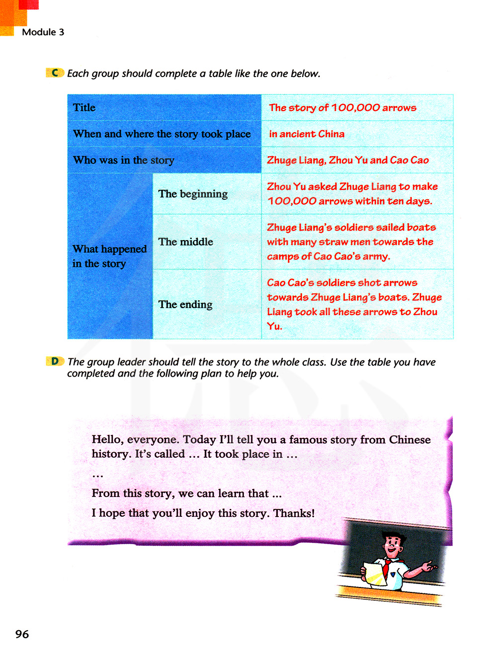 组长要把这个故事告诉全班同学。使用你已经完成了的表格和下面的计划帮助你。