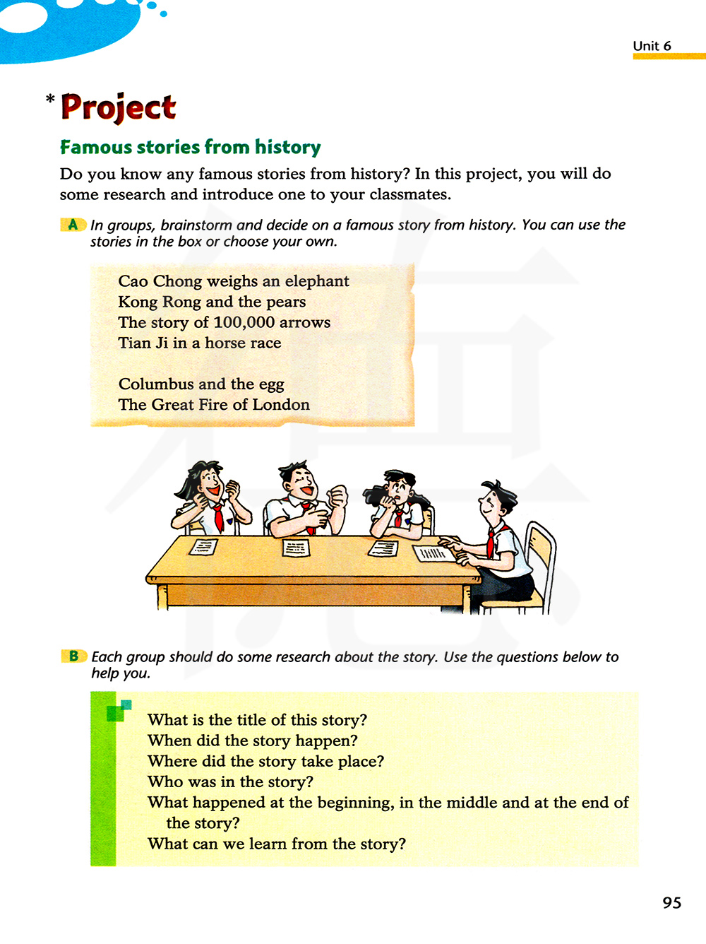 你知道一些历史上著名的故事吗?在这个课题里,你将会做一些调查,并把其中的一个介绍给你的同学。小组进行练习,集体讨论,并决定一个历史上著名的故事。你可以使用方框里的故事或者选择一个你自己知道的。