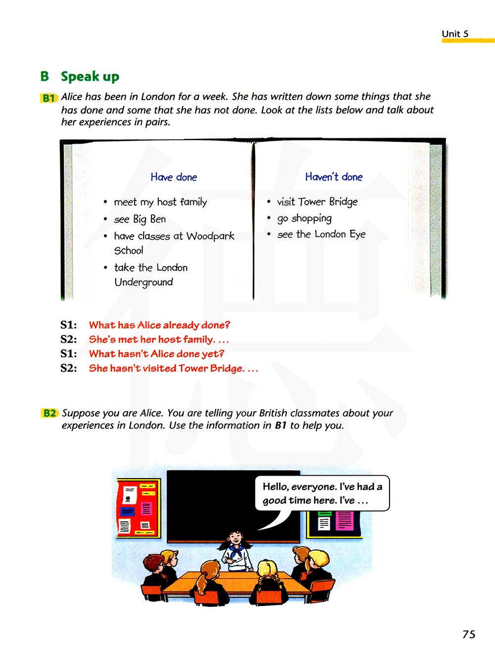 艾丽斯在伦敦一个星期了。她写下了一些她做过的事情和一些没做过的事情。看一看下面的清单,两人一组练习,谈论她的经历。
