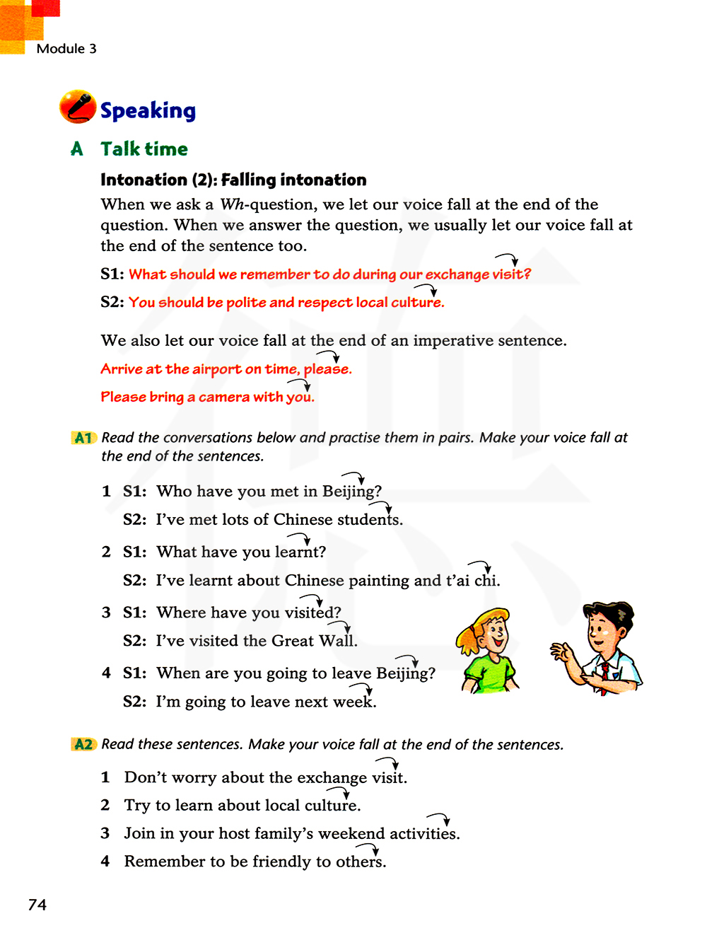 阅读下面的对话,两人一组进行练习。在巨子的末尾降低你的声音。