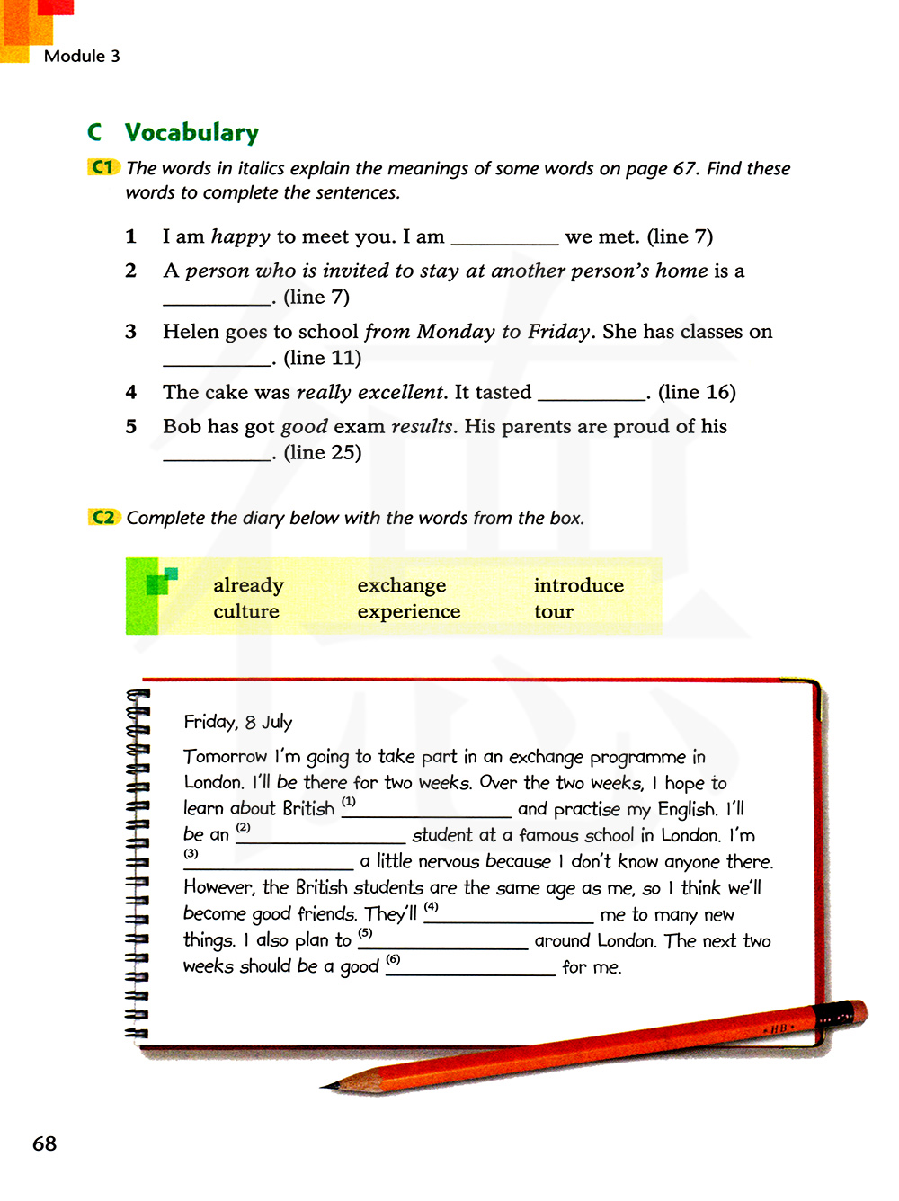 斜体字的单词解释了第67页的一些单词的意思。找到这些单词,并完成句子。