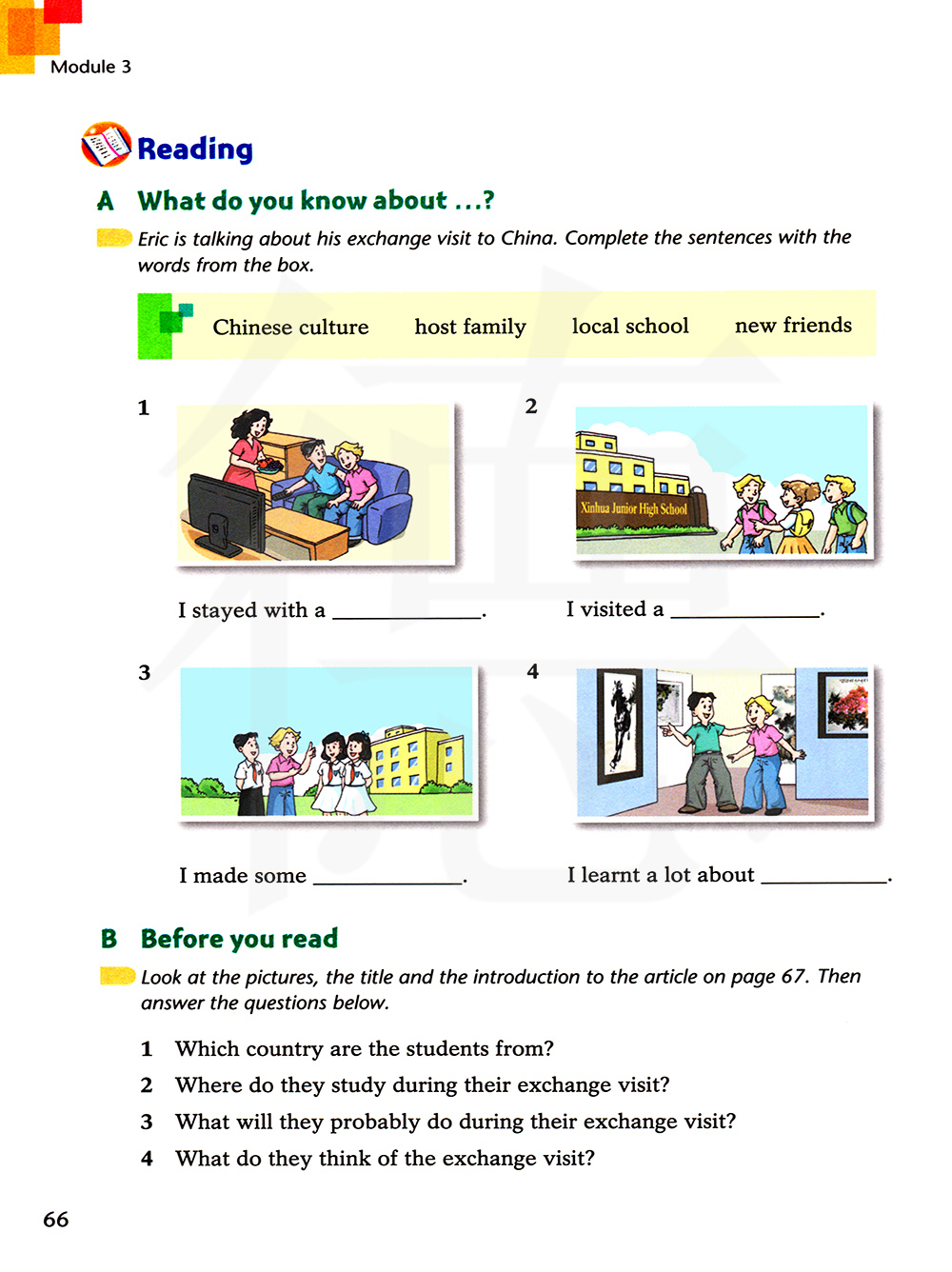 埃里克在谈论他去中国的交流访问。用方框里的单词完成这些句子。