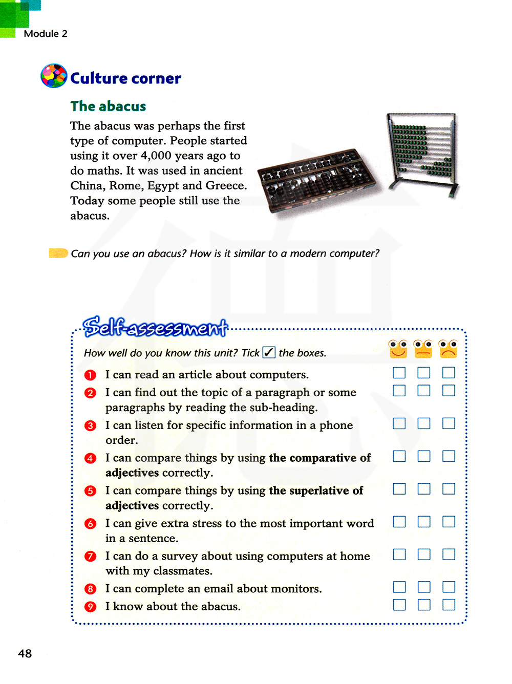 我可以和我的同学做一个关于在家使用电脑情况的调查。我可以完成关于显示器的一封电子邮件。我了解算盘。