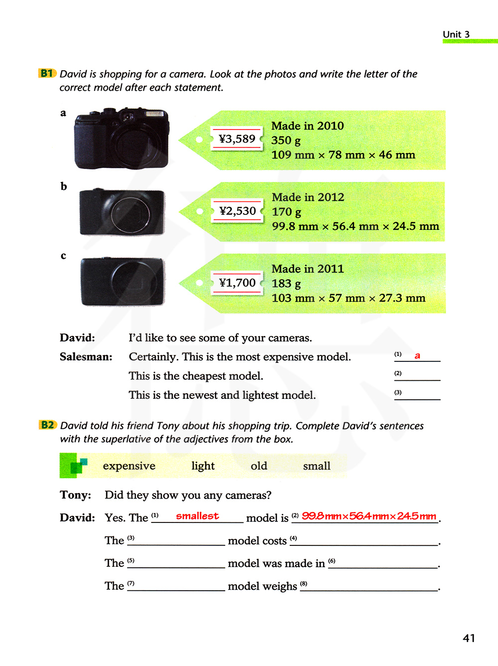 大卫购买相机。看一看相片,并在每一个说明的后面写上正确的机型的字母。