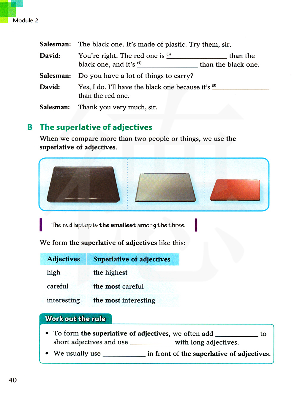 形容词 形容词最高级 高的 最高的 小心的,细心的 最小心的 最细心的 有趣的 最有趣的