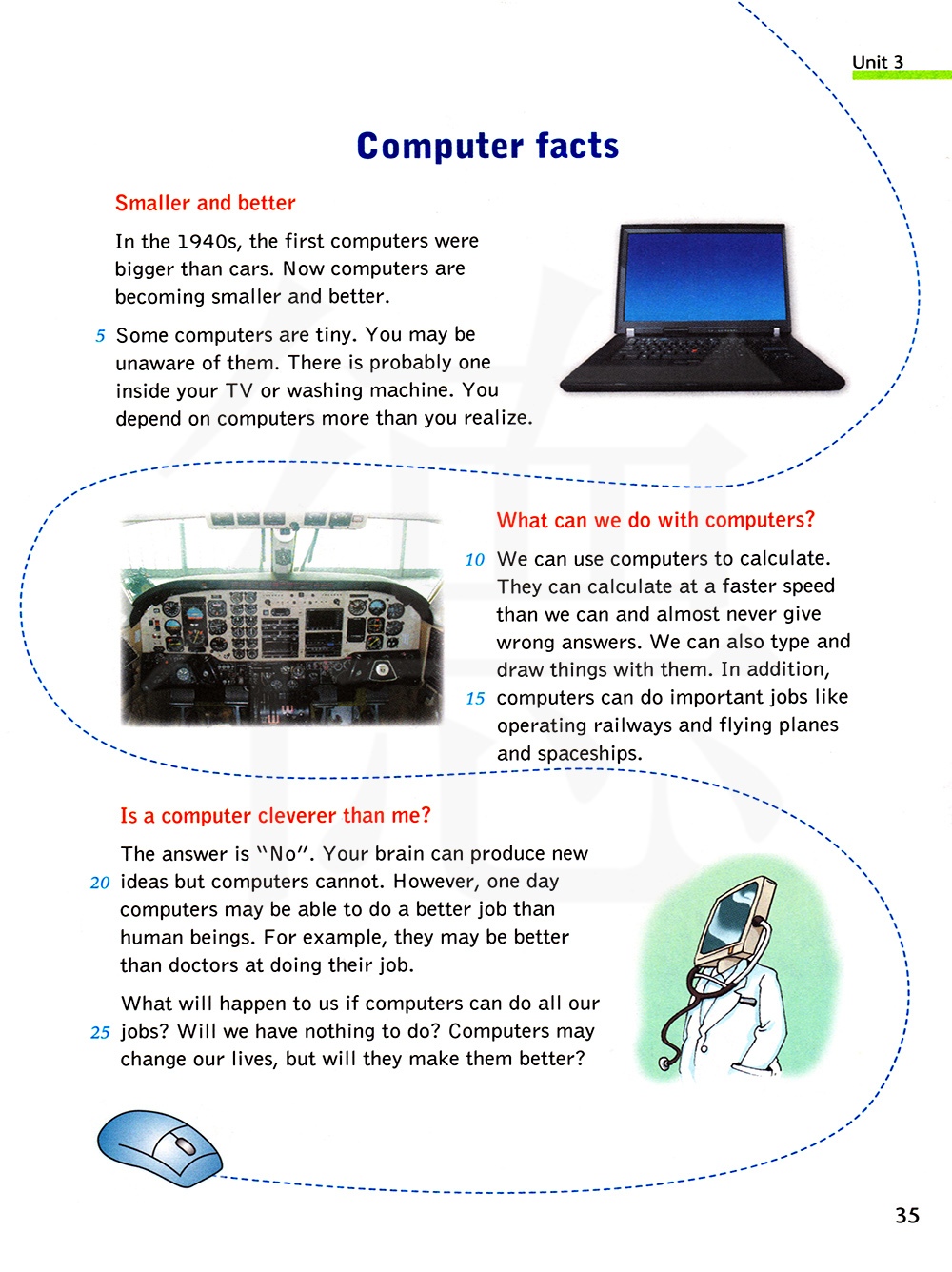 我么可以用电脑计算。它们可以用比我们更快的速度计算。甚至几乎没有给出过错误答案。我们页也可以用它们打字和画东西。另外,电脑可以做重要的工作,比如控制铁路系统、飞机和太空飞船。