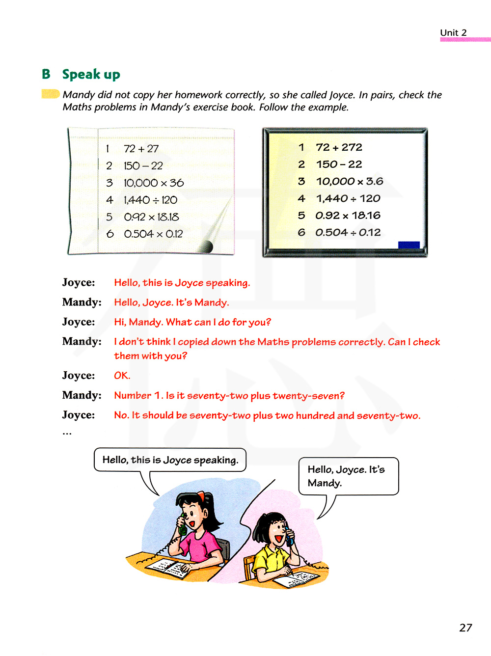 曼迪抄错家庭作业了,所以她打电话给乔伊斯。两人一组练习,核对曼迪练习本上的数学问题。参照例子。