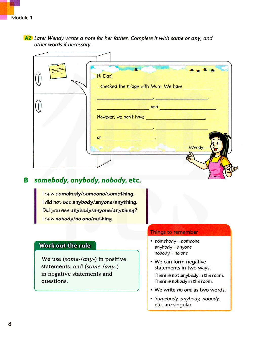 后来,温迪写了一张便条给她的爸爸。用some或者any完成这张便条,如果有必要的话也可以用上其他单词。