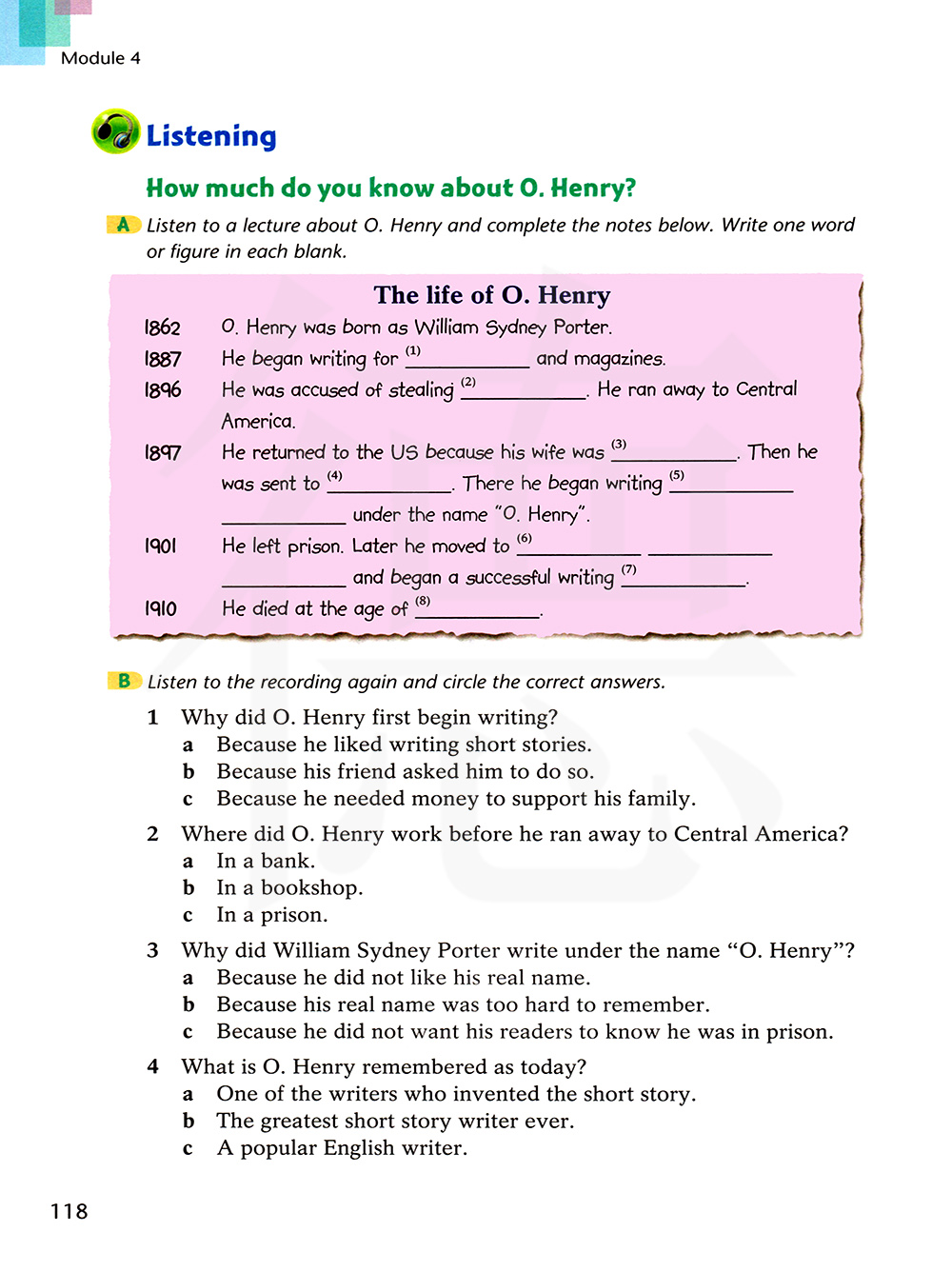 A 听一个关于欧亨利的讲座并完成下面的笔记,每空一个单词或一个数字。