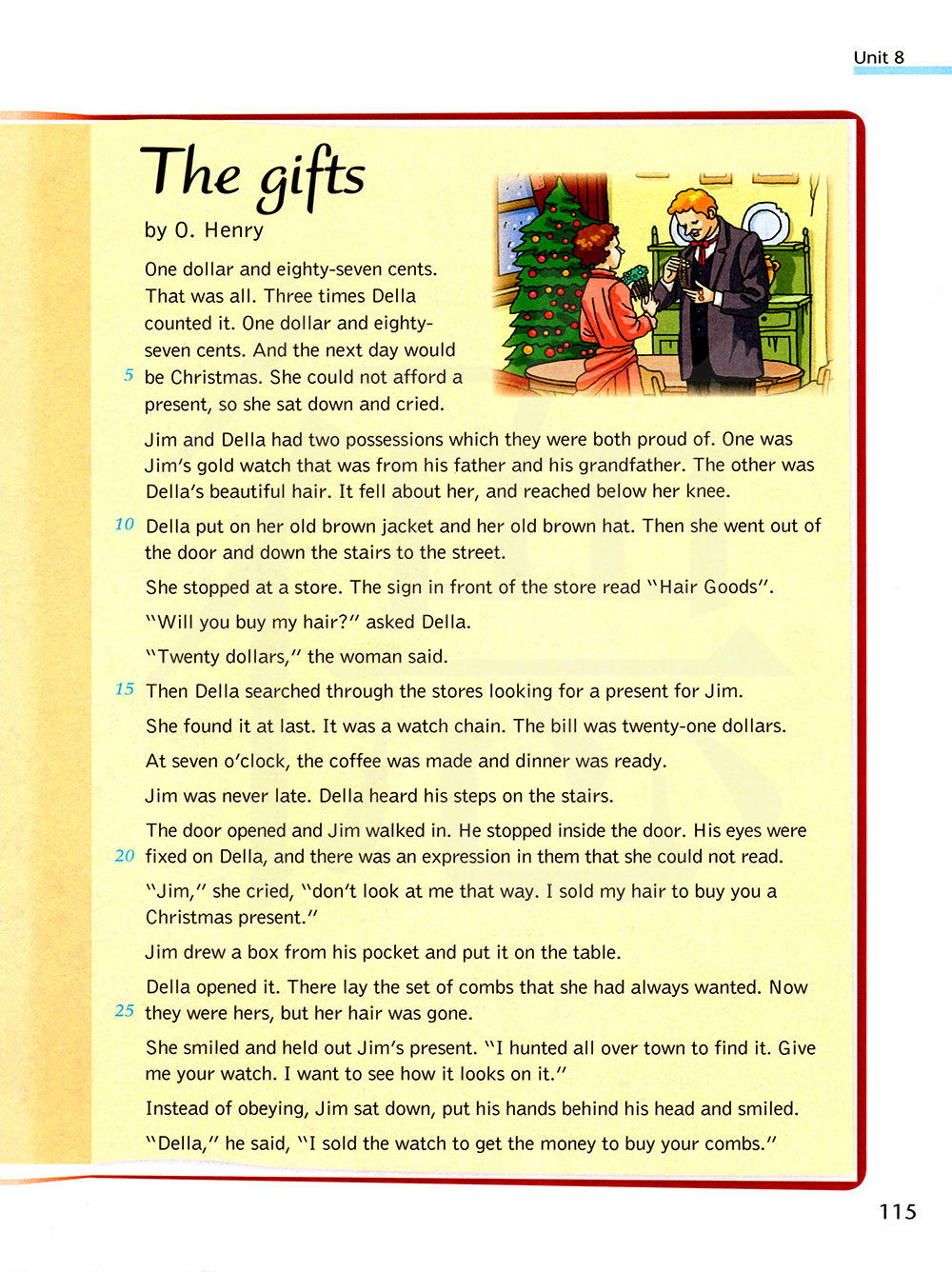 然后戴啦在所有的店铺里搜寻送给吉姆的礼物。她最终找到了,那是一条表链,价格是21美元,七点了,咖啡煮好了。吉姆从不挽回。戴啦听到了他上楼梯的脚步声。