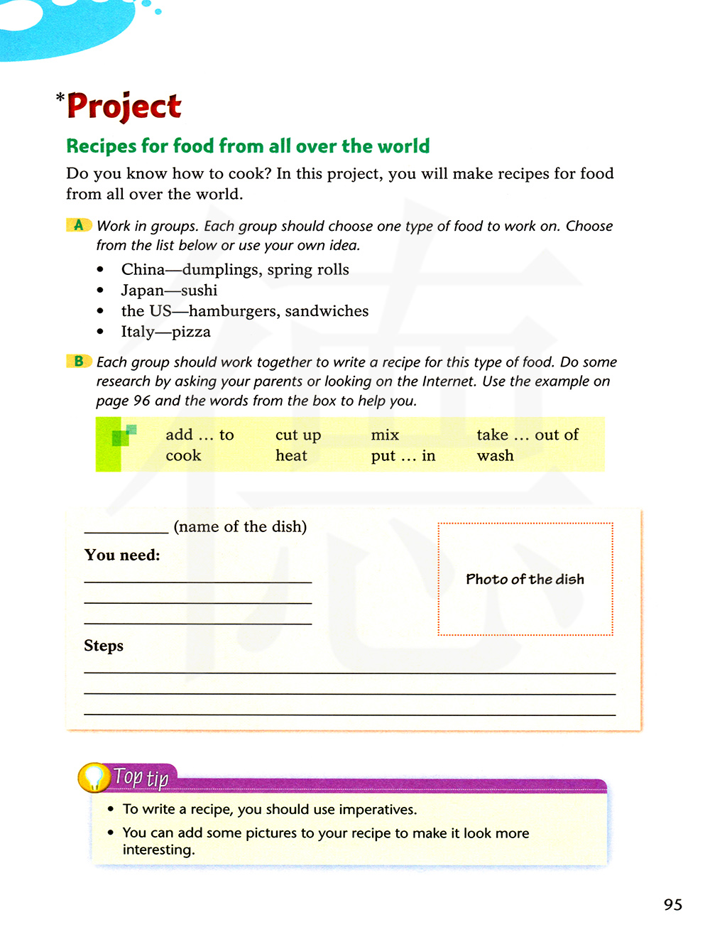 B 每组的组员要共同为这种食物撰写菜谱,咨询父母或查找来做调查,用第96页上的例子和方框里的单词来帮助你。
