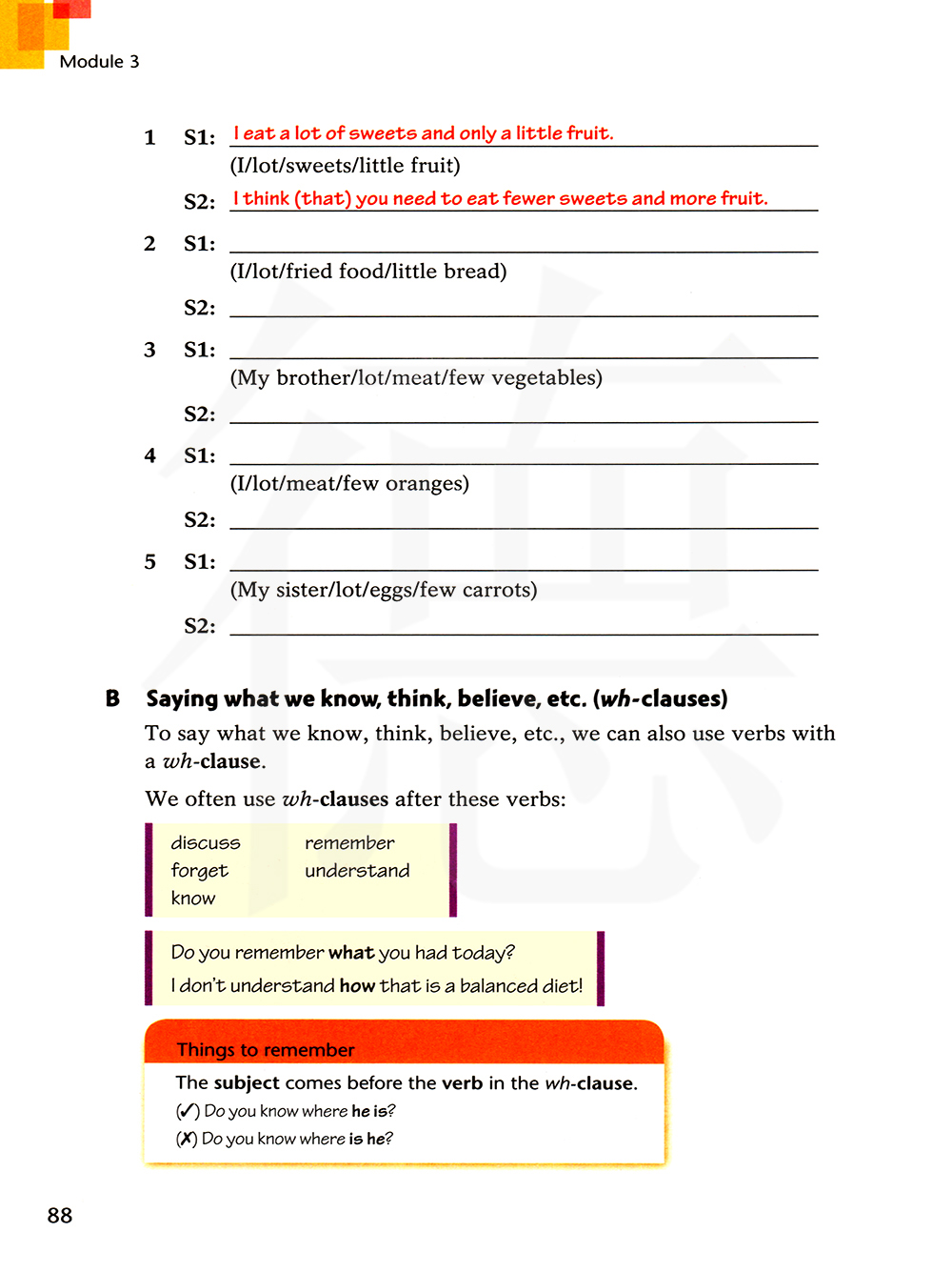 我吃很多糖果,只吃一点水果。 (我/大量的/糖果/少量水果)