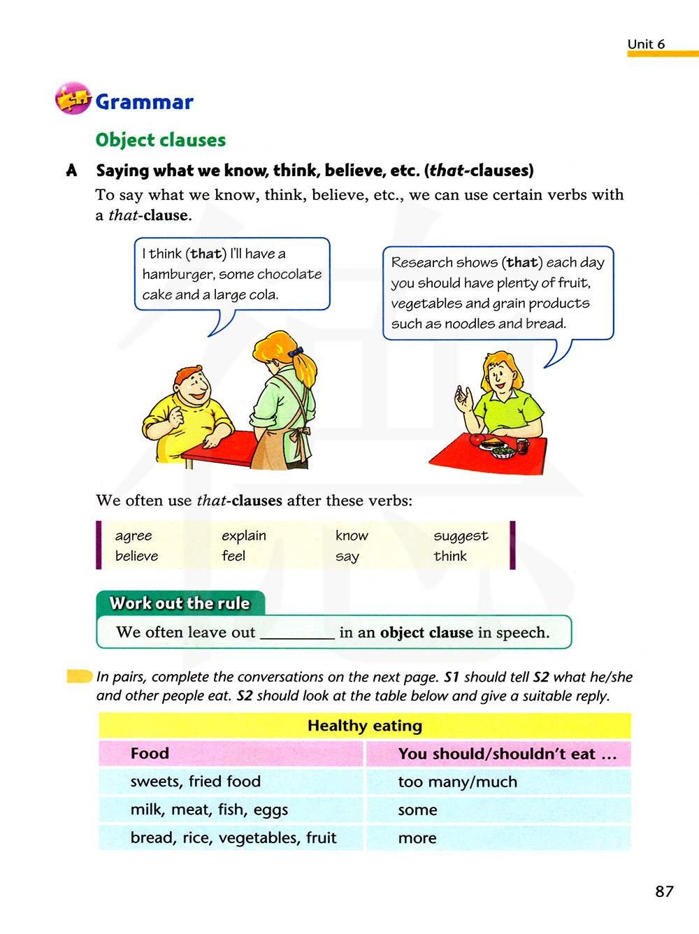两人一组,完成下页中的对话,学生一要告诉学生二他/她要吃什么,学生二要看下面的表格并给出一个合适的答复。