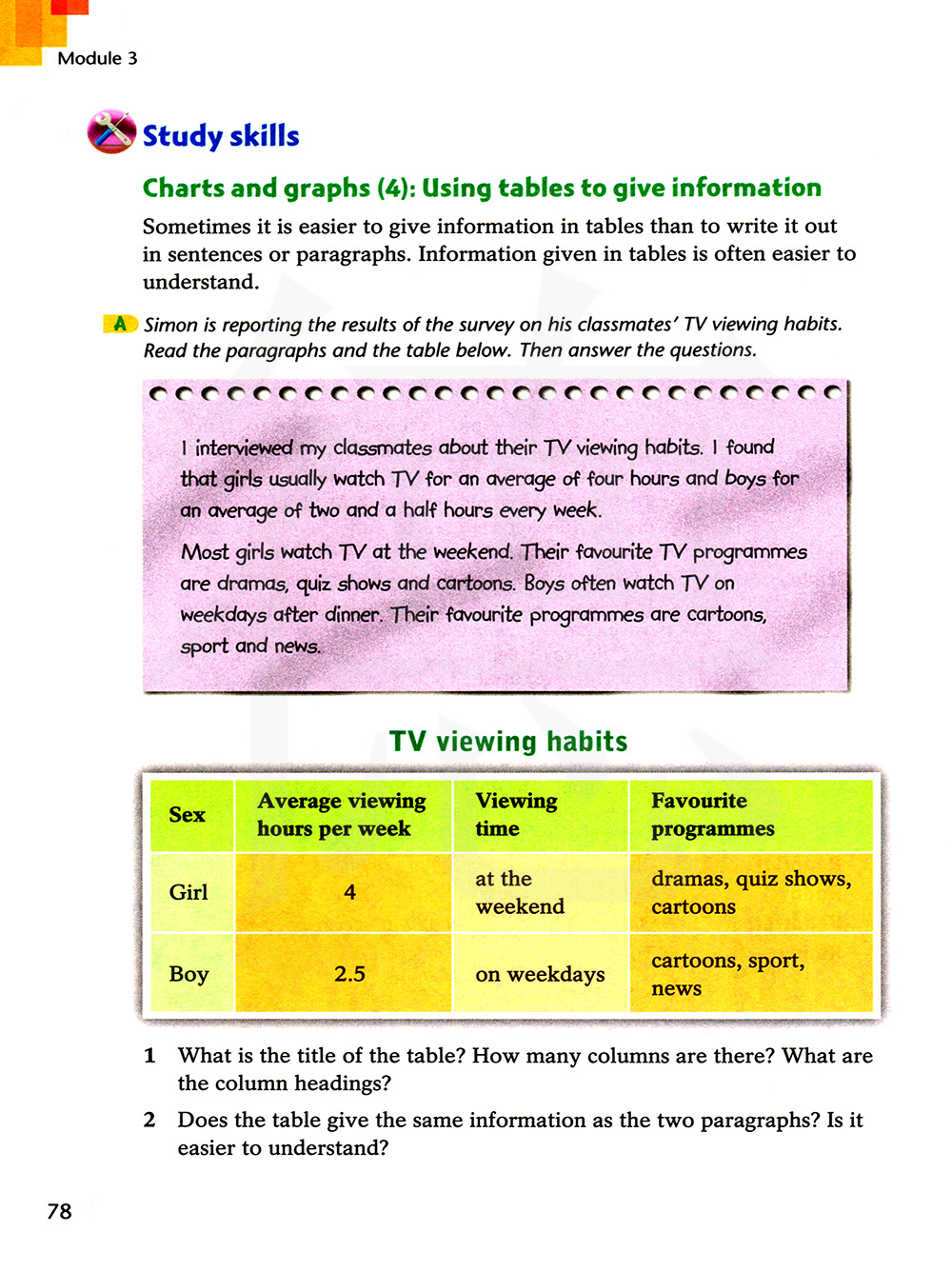 A 西蒙正在就他的同学的电视观看的调查结果做报告。读下面的段落和表格的内容,然后回答问题。
