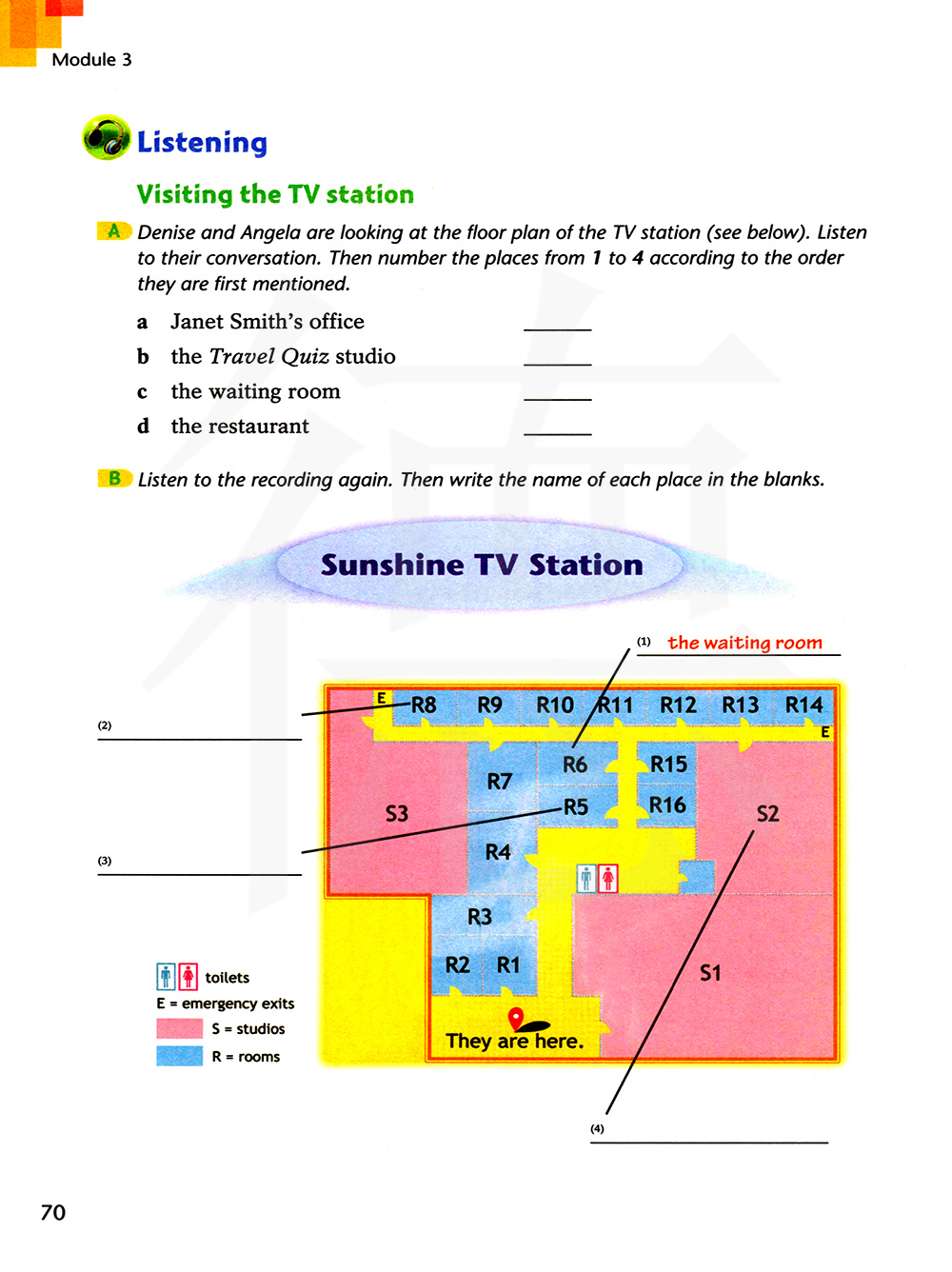 A 丹尼斯和安杰拉再看电视台的楼层平面图。听他们的对话,然后按照首次被提到的顺序为这些地方标号1-4