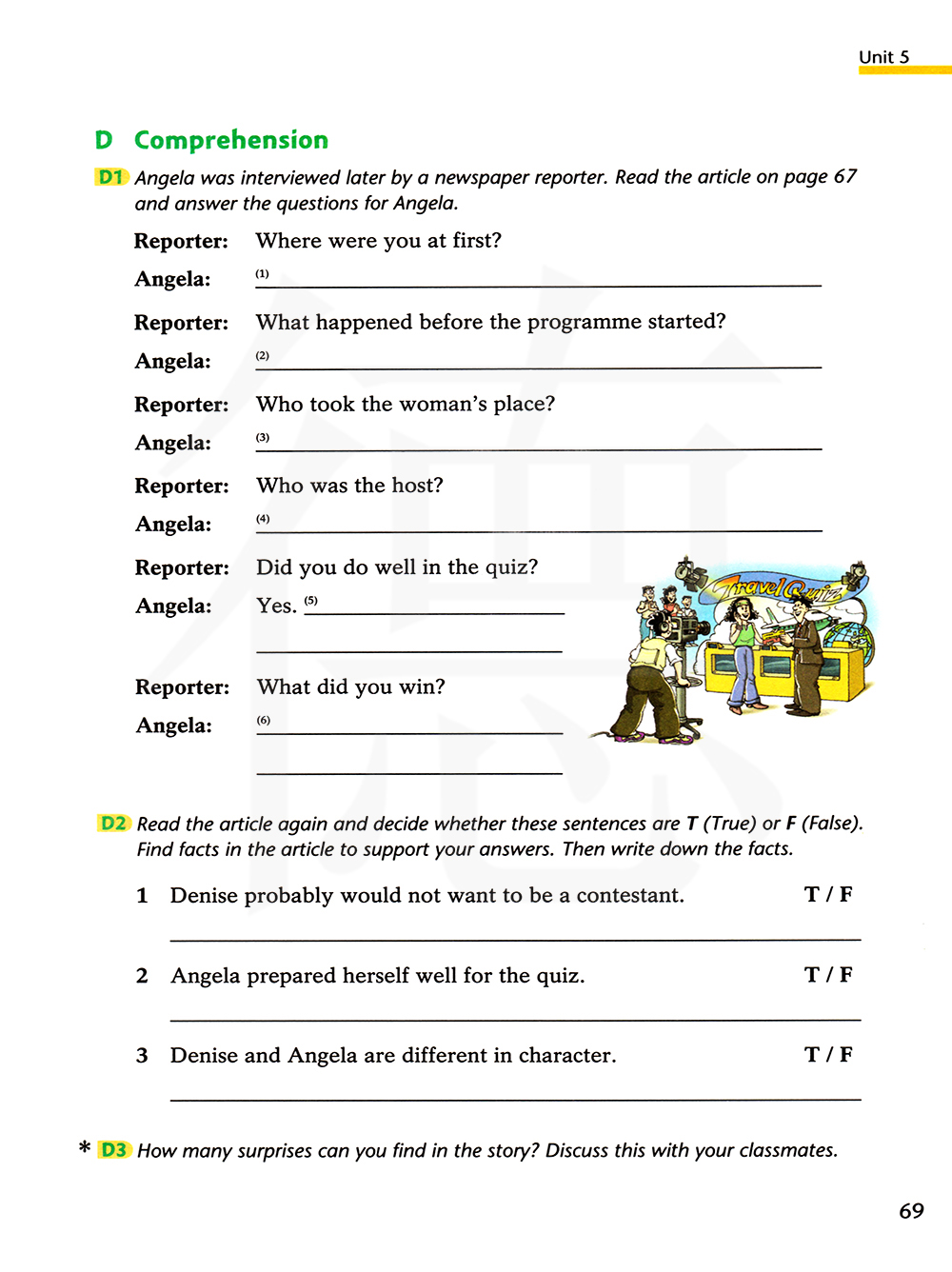 D1 安杰拉随后被一位报社记者采访了,读第67页的文章并为安杰拉回答问题。