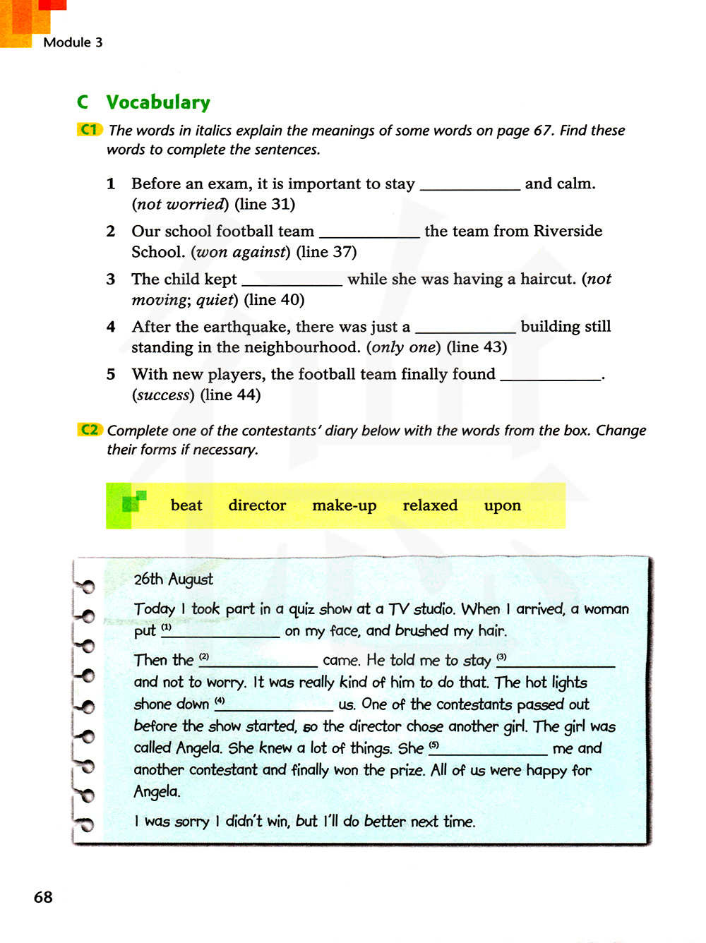 C2 用方框里的单词完成下面其中一位参赛者的日记,如有必要改变他们的形式。