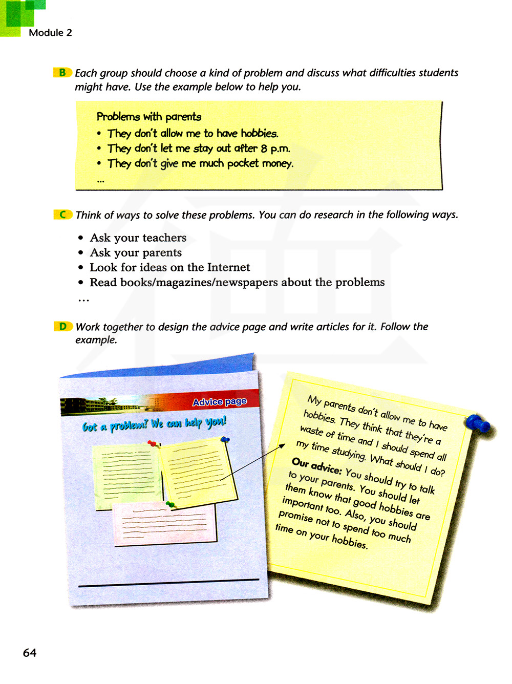 B 每组应该挑一种烦恼并讨论学生们可能遇到的困难,用下面的例子来帮助你。