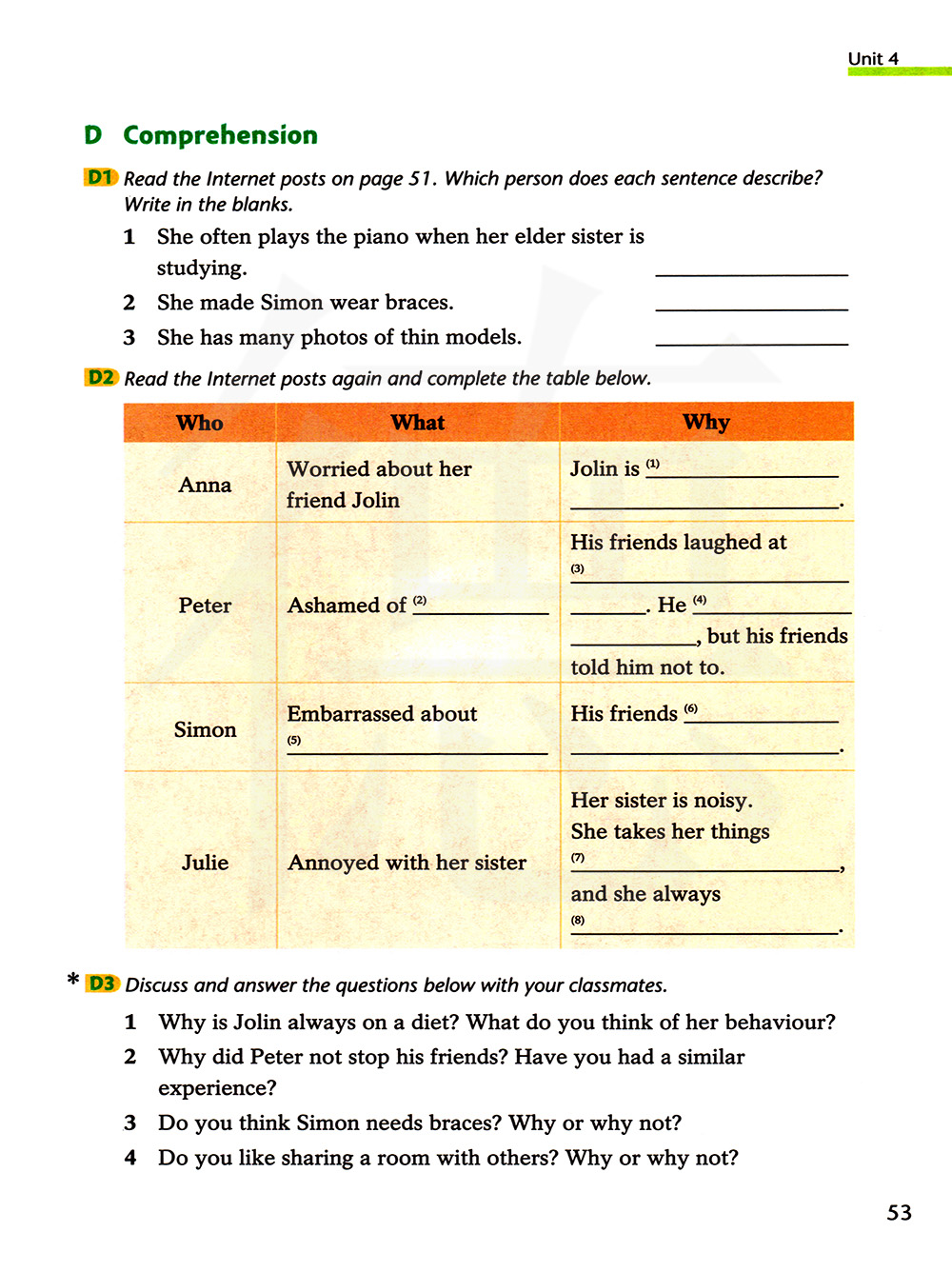 D1 读第51页上得网络帖子,每个句子分别描述了哪个人,把答案写在横线上