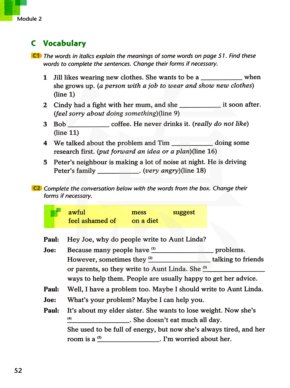 C2 用方框里的单词完成下面的对话,如有必要改变它们的形式