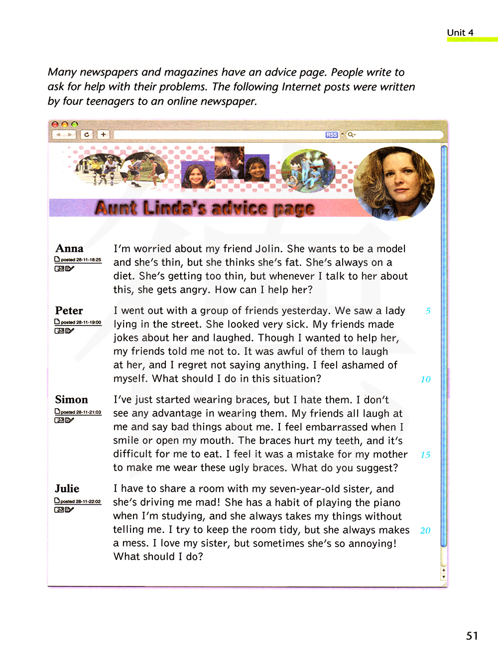 很多报纸和杂志都有建议专页,人们写信来寻求帮助以解决他们的难题。下面这些网络帖子是由位青少年写给一份在线报纸的。