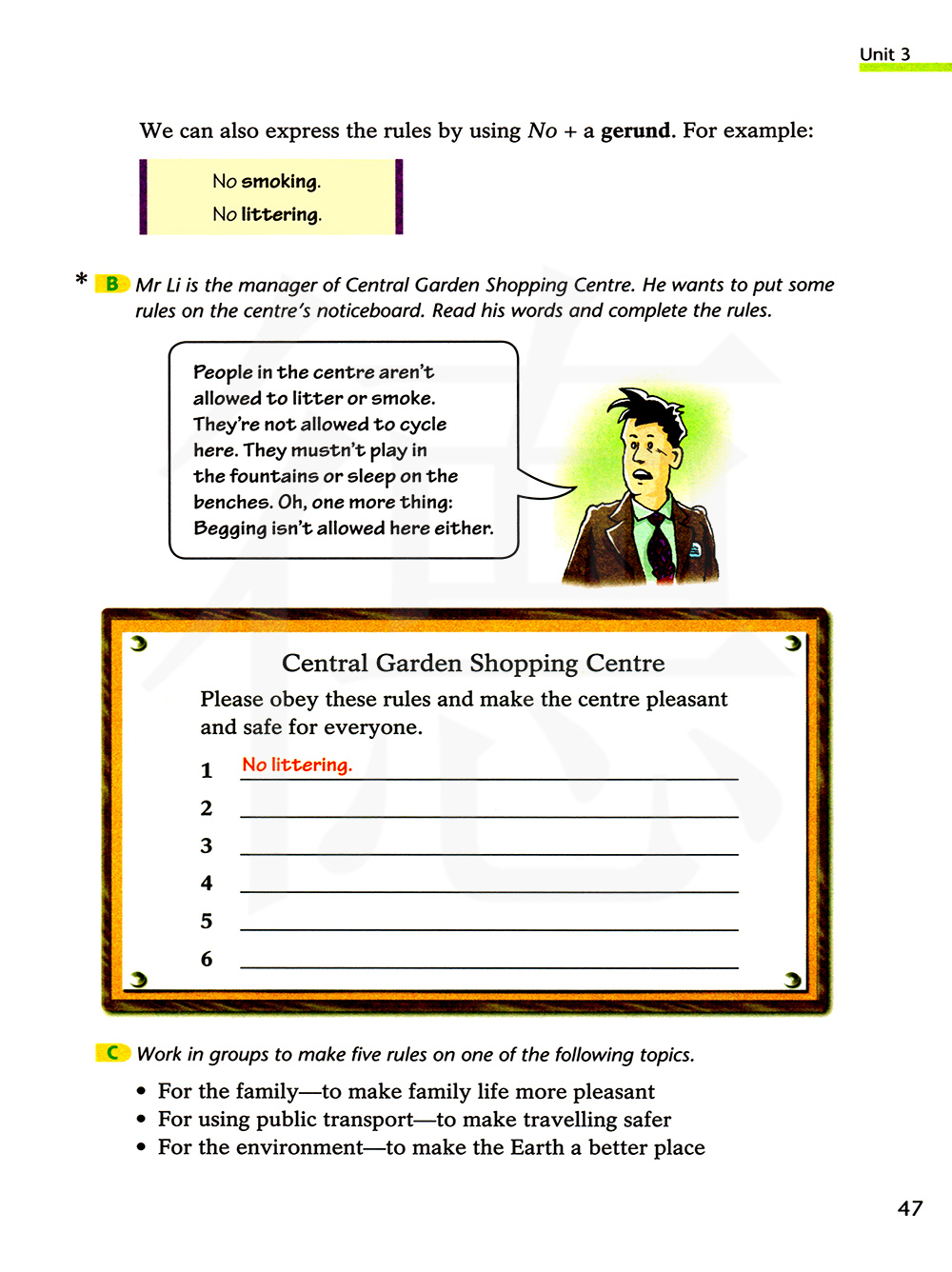 B 李先生是中央花园购物中心的经理。他想在购物中心的布告板上设置些规则,读一读他所说的话并把下面的规则补充完整。