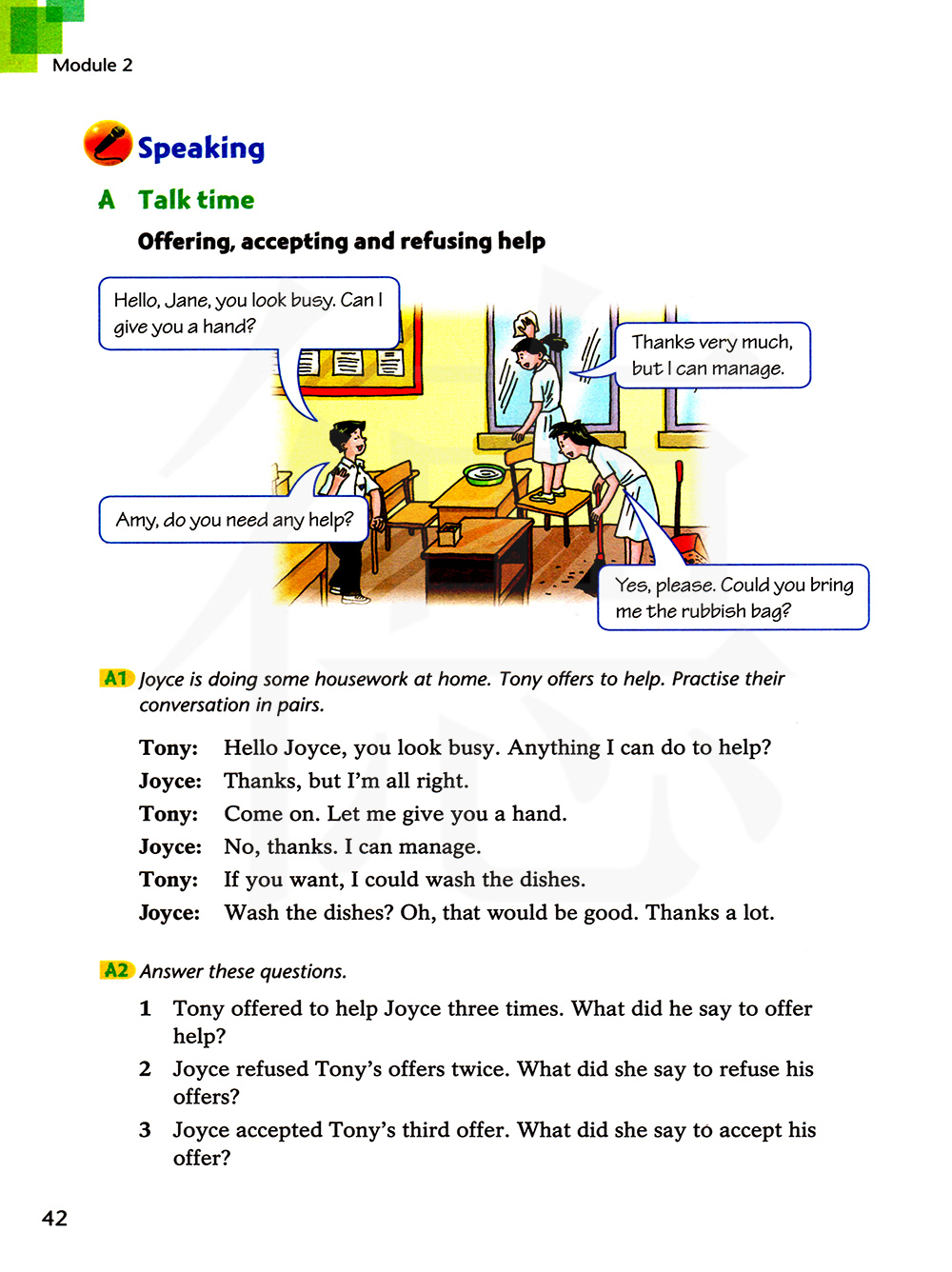 A1 乔斯正在家里做家务,托尼提供帮助,结对练习他们的对话。