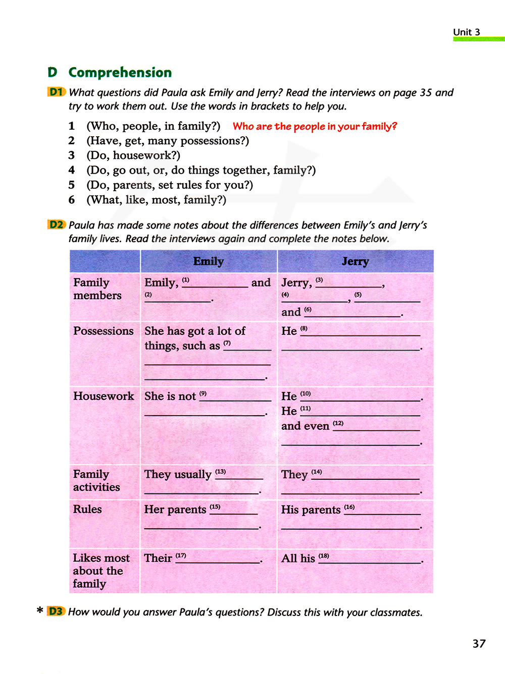 D2 宝拉就艾米莉和杰里的不同的家庭生活做了一些笔记,再读一次这篇采访稿并完成下面的笔记。
