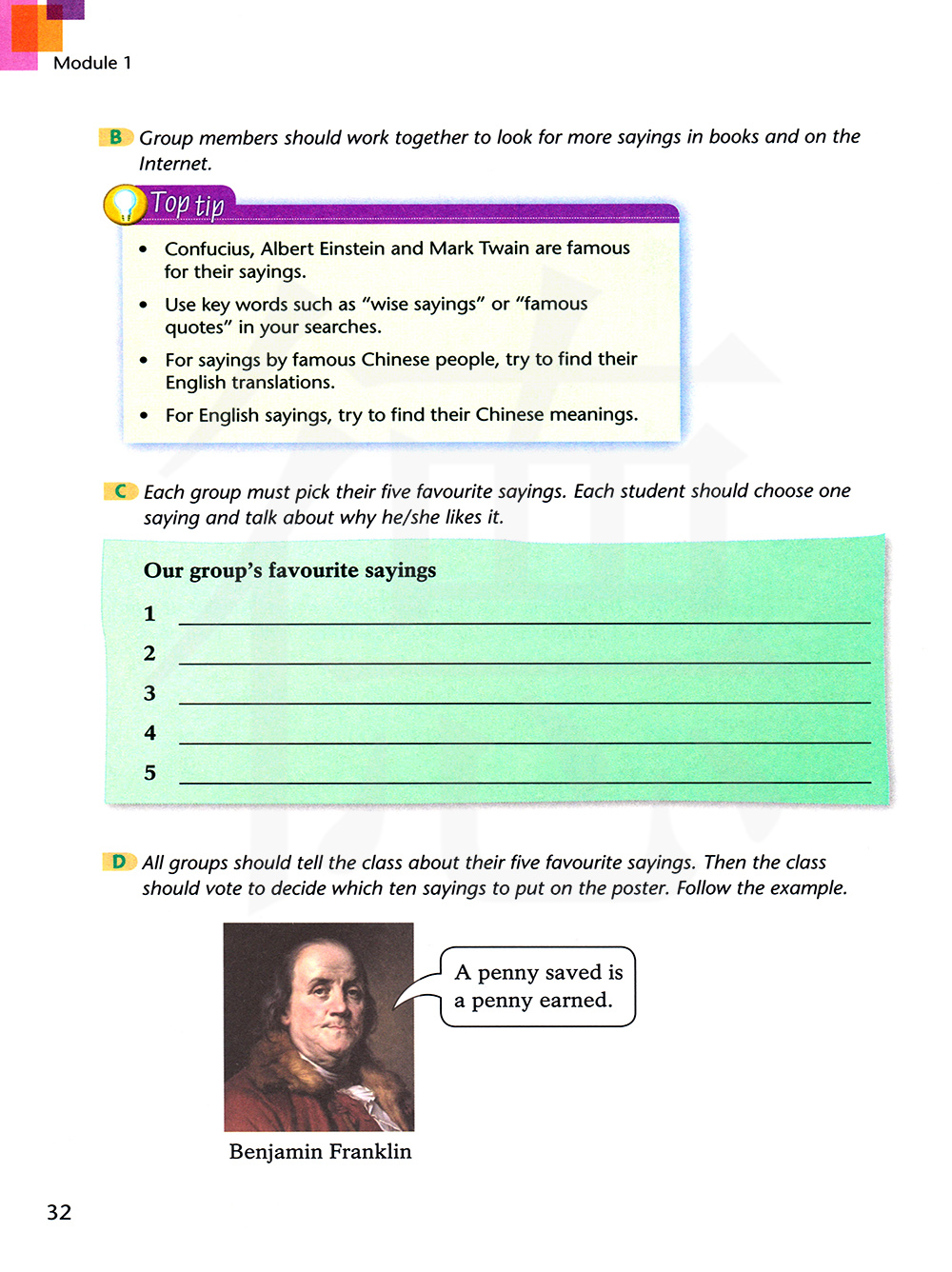 D所有小组要向全班说出他们最喜欢的名言。然后全班投票决定把哪十句名言放在海报上。仿照例子。