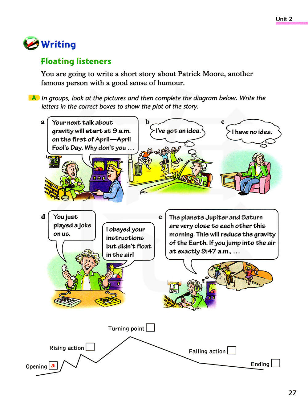 A 以小组 为单位,看图片然后完成下面的图表,在正确的方格内写上字母来表示故事的情节。