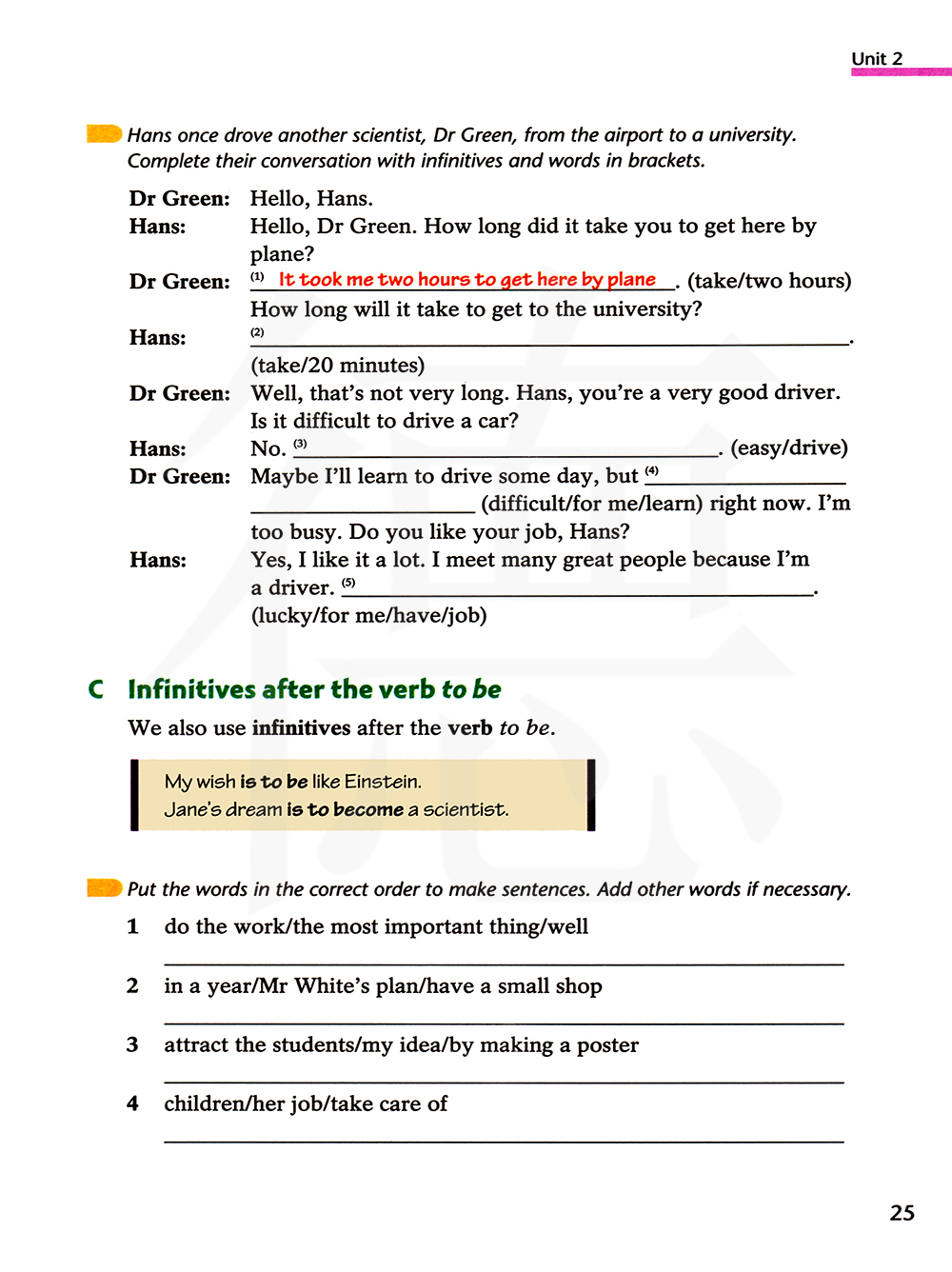 汉斯有一次栽了另一位科学家——格林博士,从飞机场到一所大学。用不定式和括号里的单词完成他们的对话。