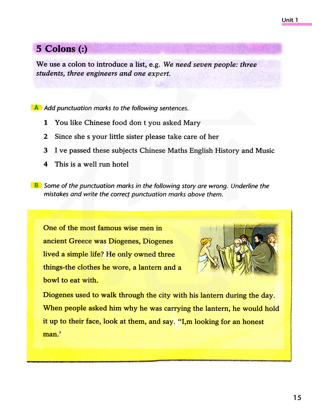 B 下面这个故事里的标点符号有些事错的,给错误的标点符号画下划线并将正确的符号写在它们上面。