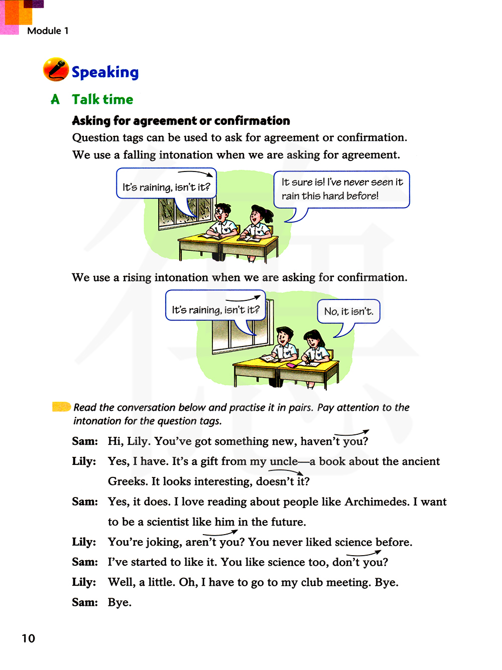 读下列对话,并和同伴练习,注意附加疑问成分的声调