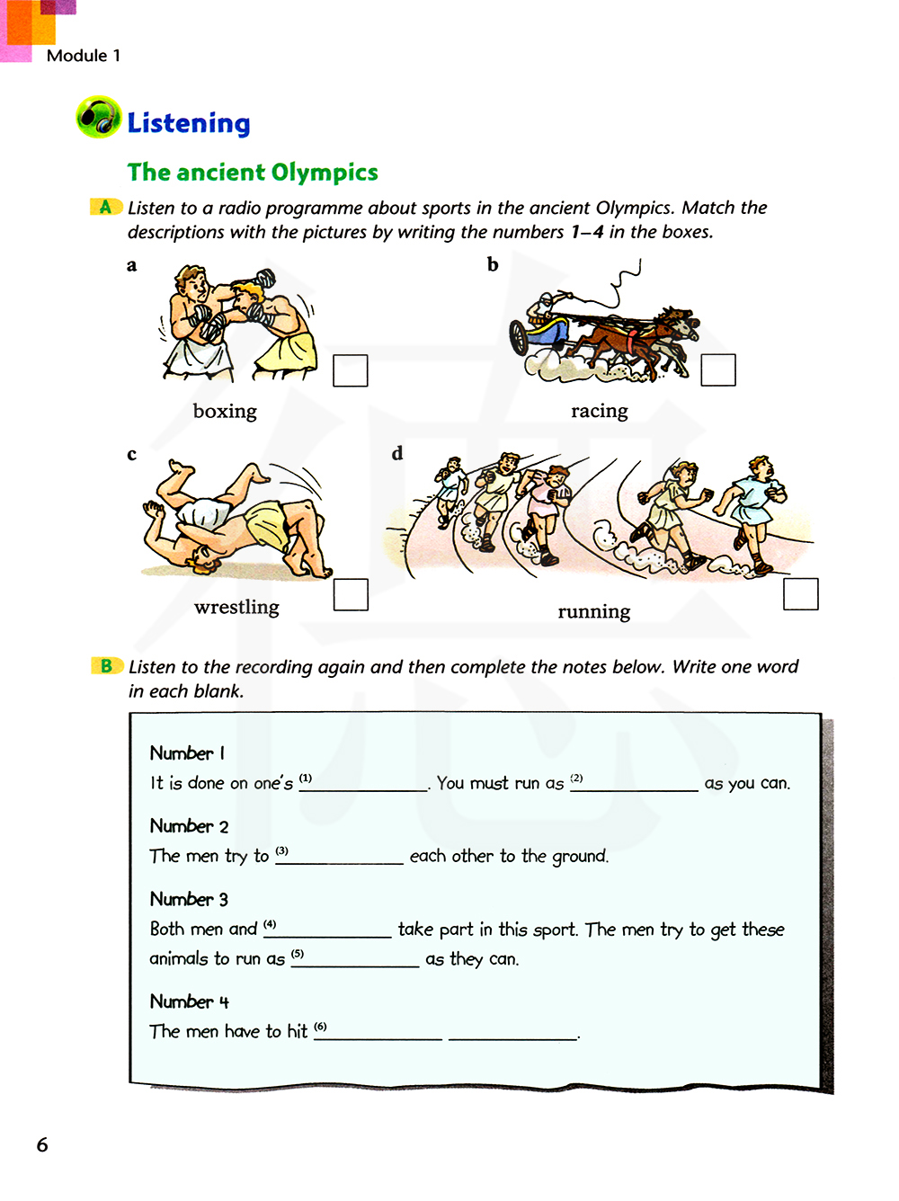 A 听一个关于古代奥运会的运动的电台节目,把描述和图片配对,在方格内写上数字1-4