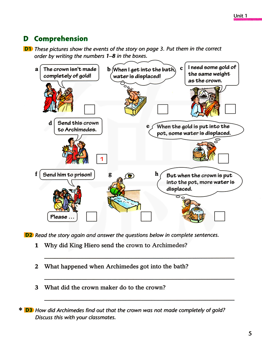 D1 这些图画展示了第3页故事的事件。把他们按照正确的顺序排列,并在方格内写上数字1-8