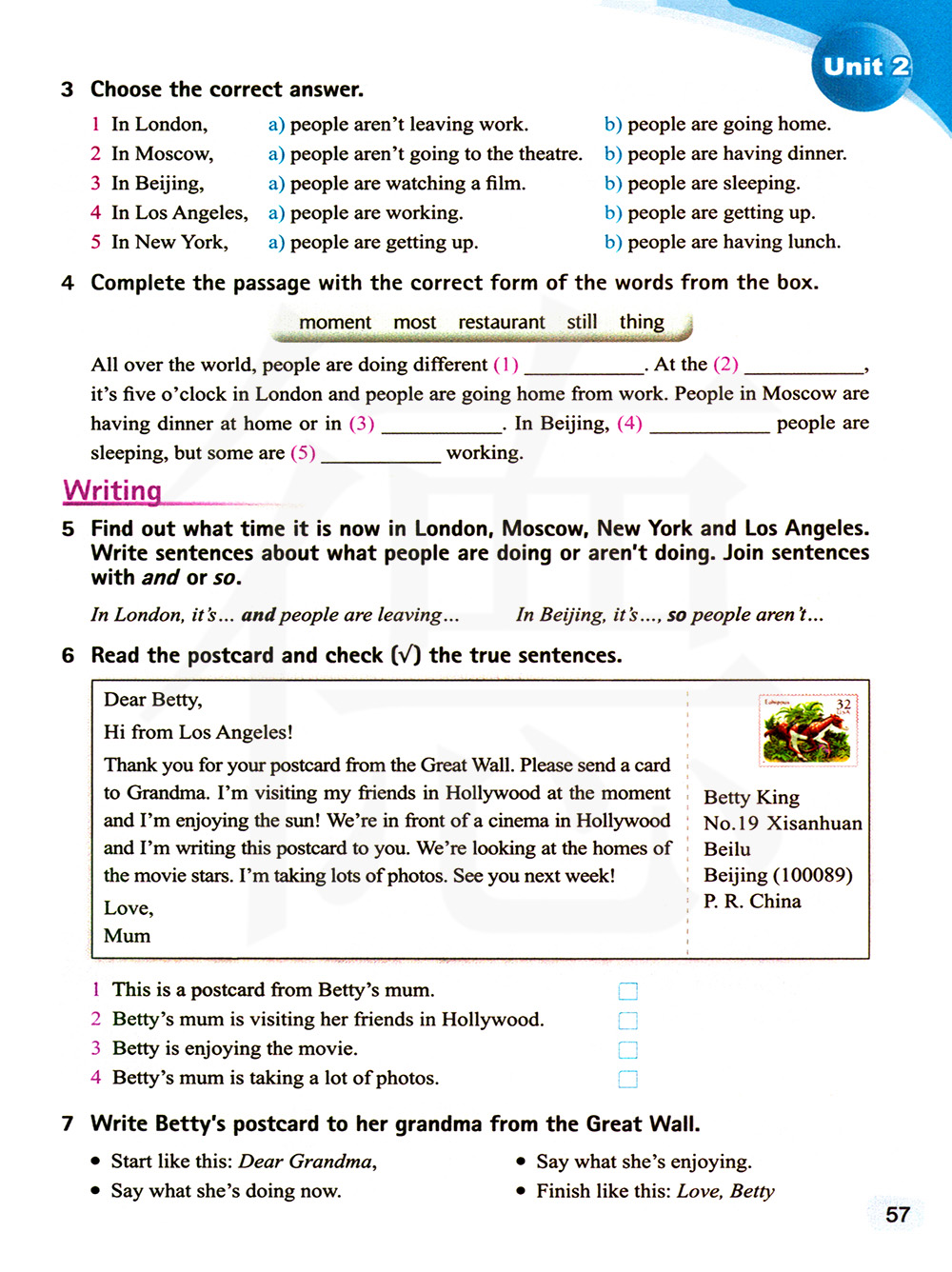 找到伦敦,莫斯科,纽约和洛杉矶各自现在的时间。写句子来面熟人们正在做的和不是正在做的事情,用and和so将句子连起来。