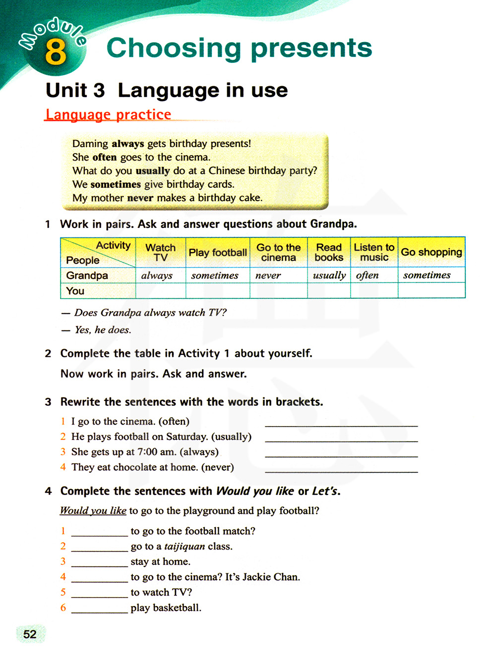 大明总是收到生日礼物。他经常去电影院。