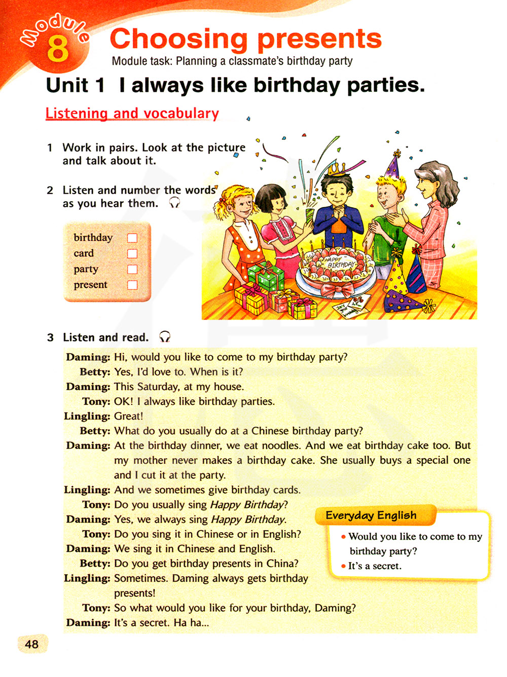 频度副词是副词的一种,通常和一般现在时连用,表示现在经常或反复发生的动作。本单元出现的频度副词有always, usually, sometimes, never。Always是频度最大的词,意为“总是;永远”;usually意为“通常”,即很少有例外,频度仅次于always; sometimes意为“有时”;never意为“从不”。