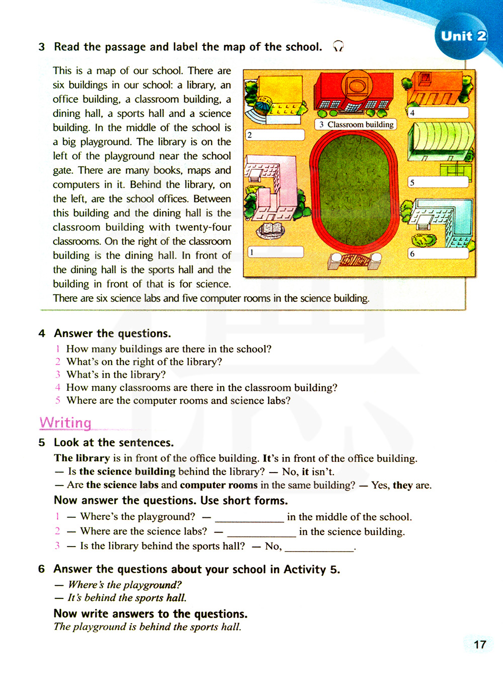 这是我们学校的地图。我们学校有六幢大楼:一栋图书馆,一栋办公楼,一栋教学楼,一栋食堂,一栋体育馆和一栋科技楼。在学校中间有个大操场。图书馆在操场的左边,靠学校的大门。里面有很多书,地图和计算机。图书馆后面左侧是学校办公楼,办公楼和食堂之间是教学楼。它有24间教室。教学楼右边是食堂。体育馆在食堂的前面,在体育馆前面的是科学楼。科学楼里有六个科学实验室和五个计算机室。